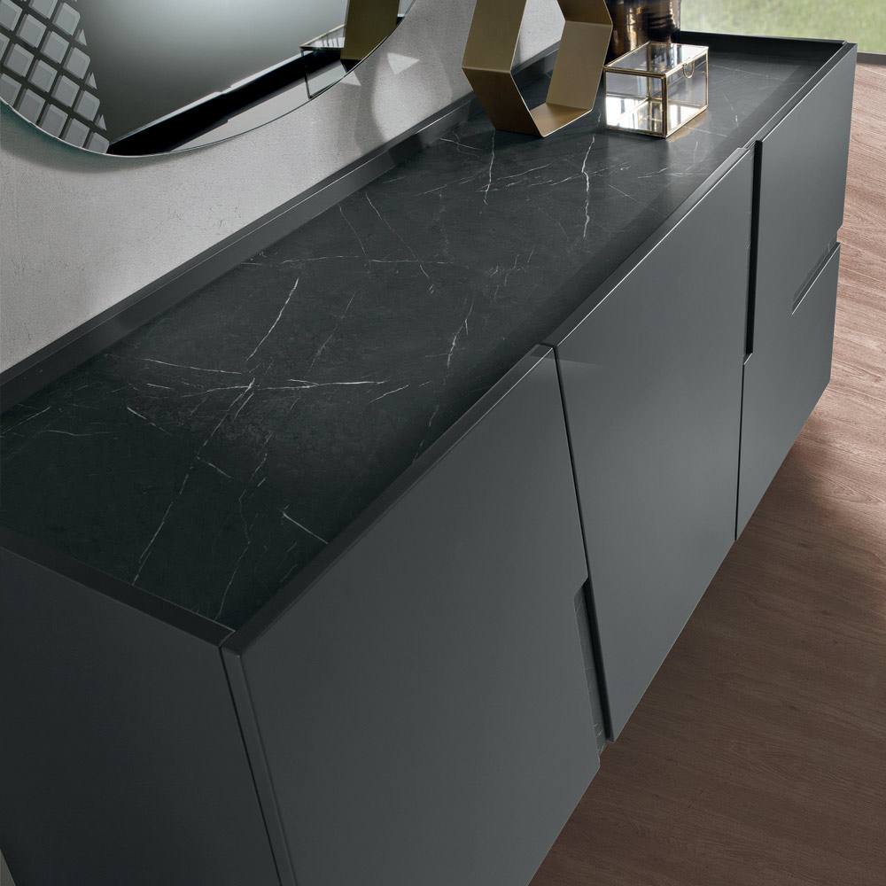 الهيكل مصنوع من مادة الميلامين وأبواب من خشب MDF مطلية ، مما يخلق سطحًا موحدًا وأنيقًا. ويزدان التصميم بإضافات زخرفية وأسطح متباينة ، متوفرة بتشطيبات مثل تأثير الرخام أو تأثير خشب الساج أو مرآة برونزية ، مما يضفي عمقًا وشخصية مميزة على التصميم.