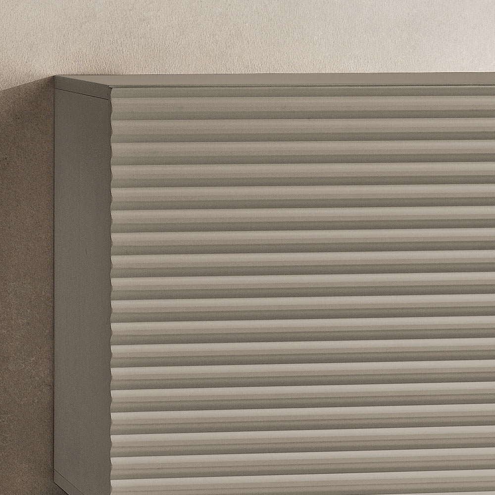 تتميز أبواب MDF المطلية بمادة PVC بتصميم خطوط أفقية بارزة تُضفي عمقًا وحيوية على السطح، مما يخلق تأثيرًا رسوميًا أنيقًا. ويكتمل التصميم بهيكل من الميلامين المتناسق بتأثير لوني متناغم، مما يجعل التركيبة متناغمة وعصرية.