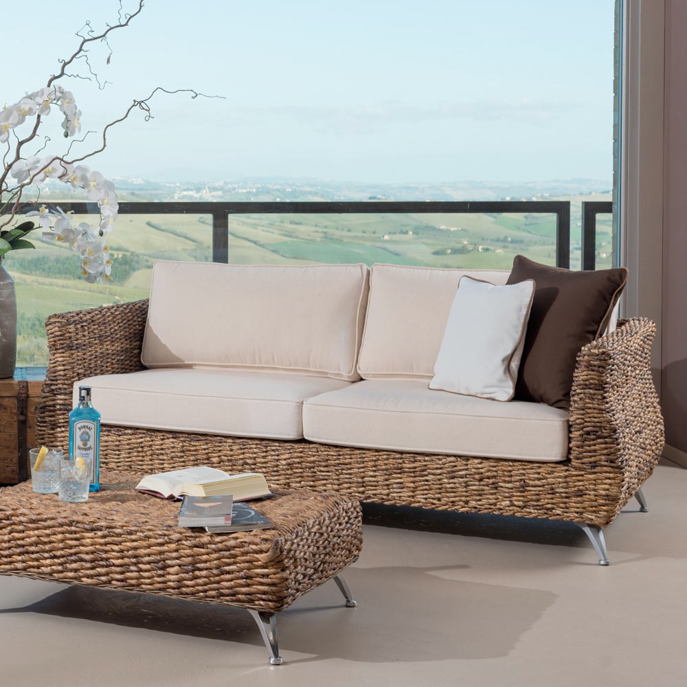 أريكة خارجية مكونة من مقعدين أو ثلاثة مقاعدمن شجرة الموز الطبيعيةالمنسوجة يدويًا بدقة والمجهزة بالوسائد بشكل قياسيباللون " Ecru " القياسي .