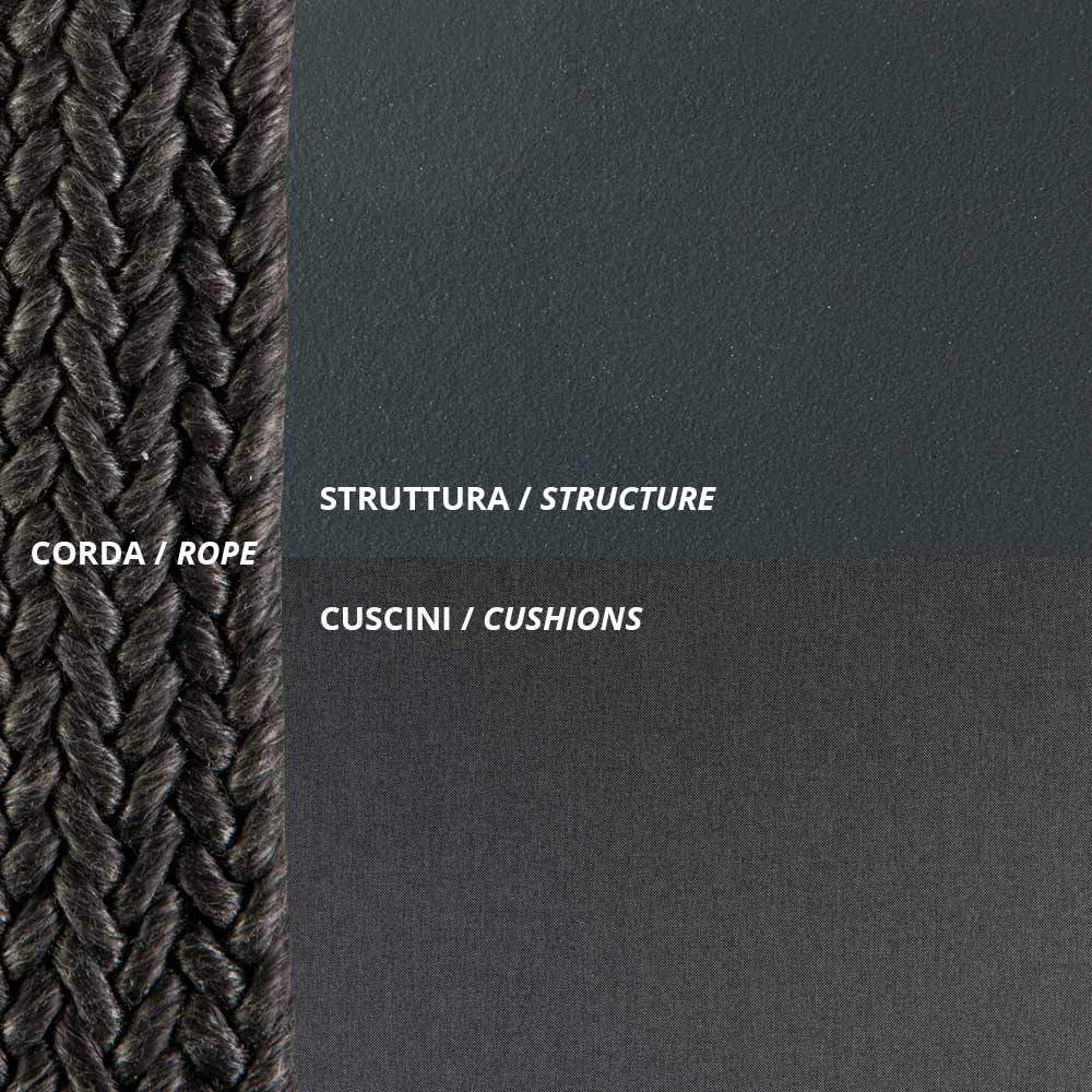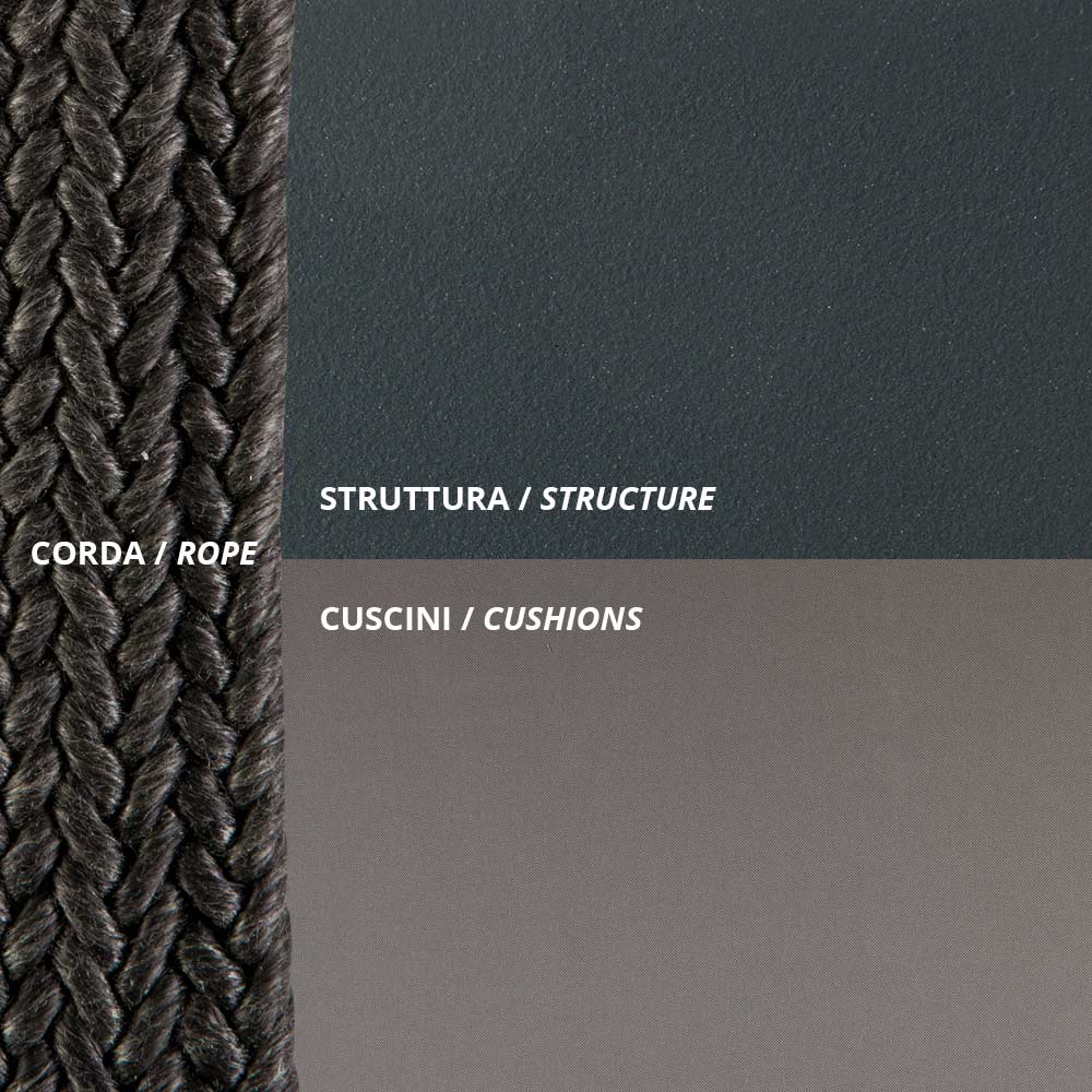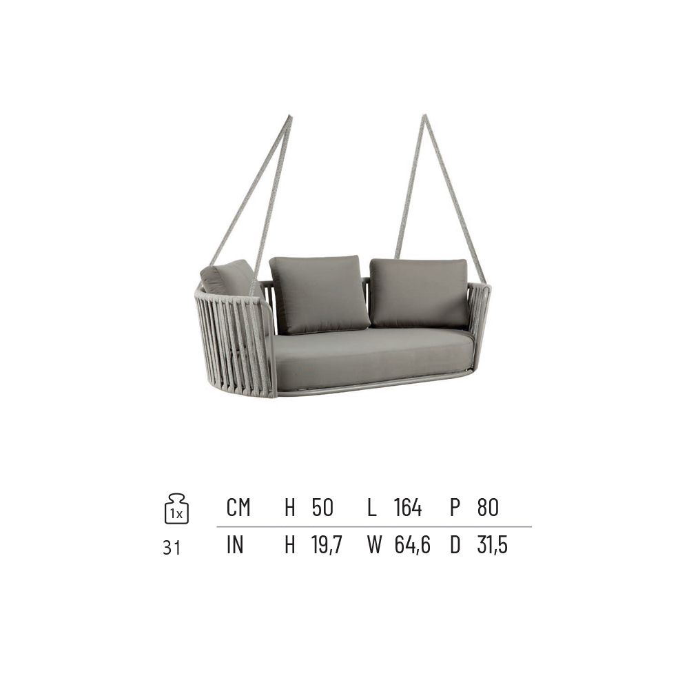 أرجوحة حديقة لشخصين،مصنوعة بالكامل في إيطاليا، بهيكل من الحديد المجلفن المطلي بالمسحوق، مطلي بحبل رمادي وأسود عتيق، ومقعد مغطى بقماش بولي بروبيلين 100% . تجتمع الخفة والمتانة لخلق قطعة أثاث مريحة ومميزة، تتميز بتصميم أصلي وراقي. يوفر المقعد الكبير والمريح، إلى جانب شكله المريح والمتناغم،راحة مثالية، بينما يمنح المزيج الأنيق من المواد المختارة جمال المنتج طابعًا راقيًا وأسلوبًا عصريًا .