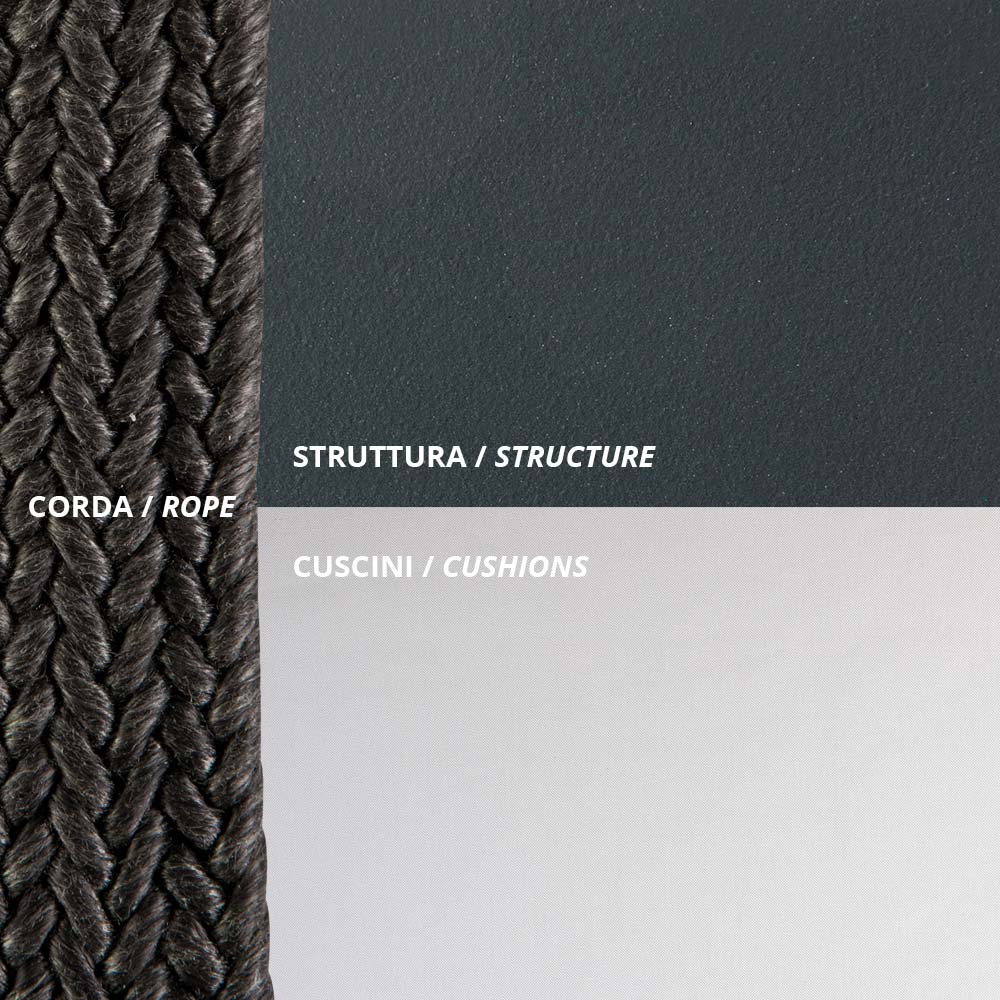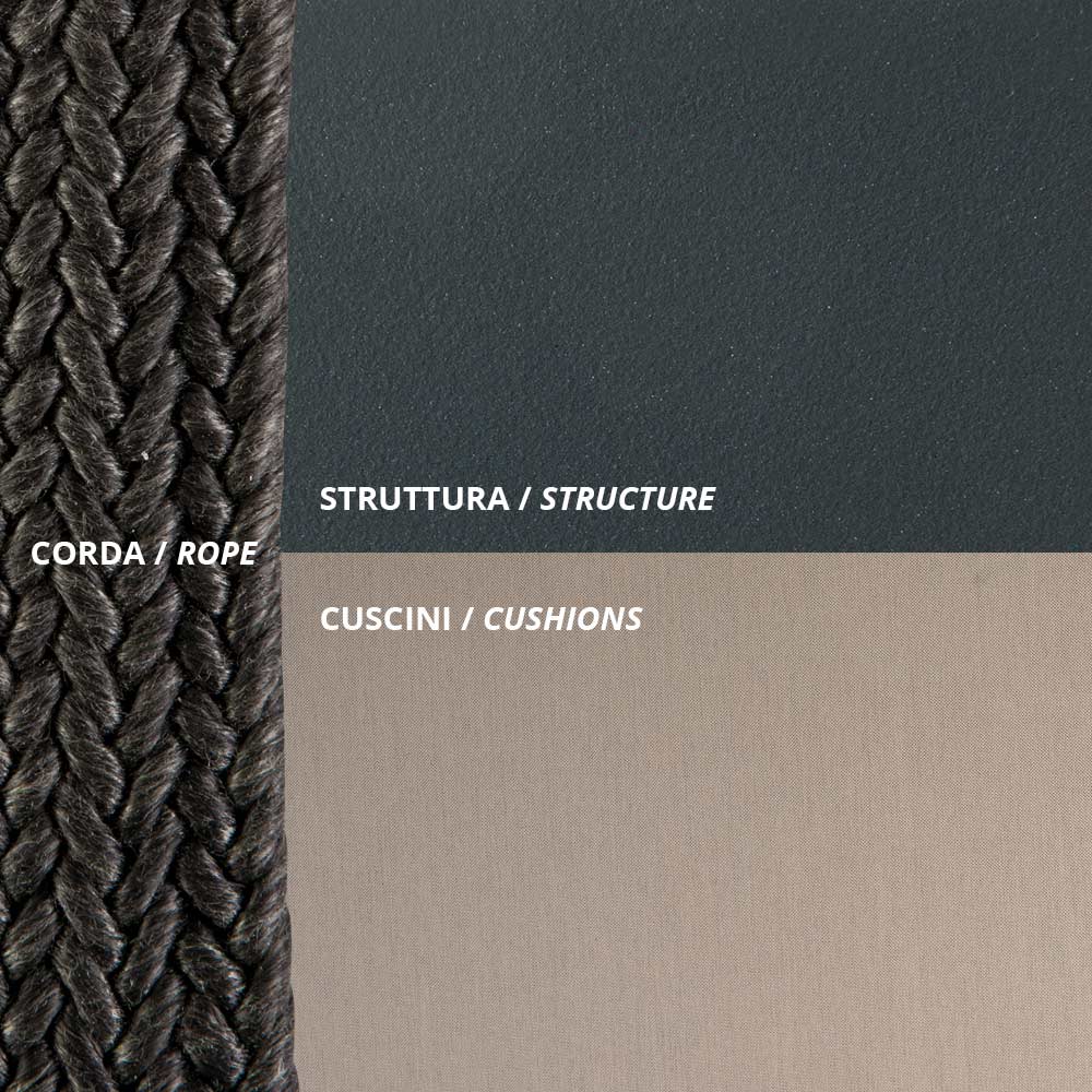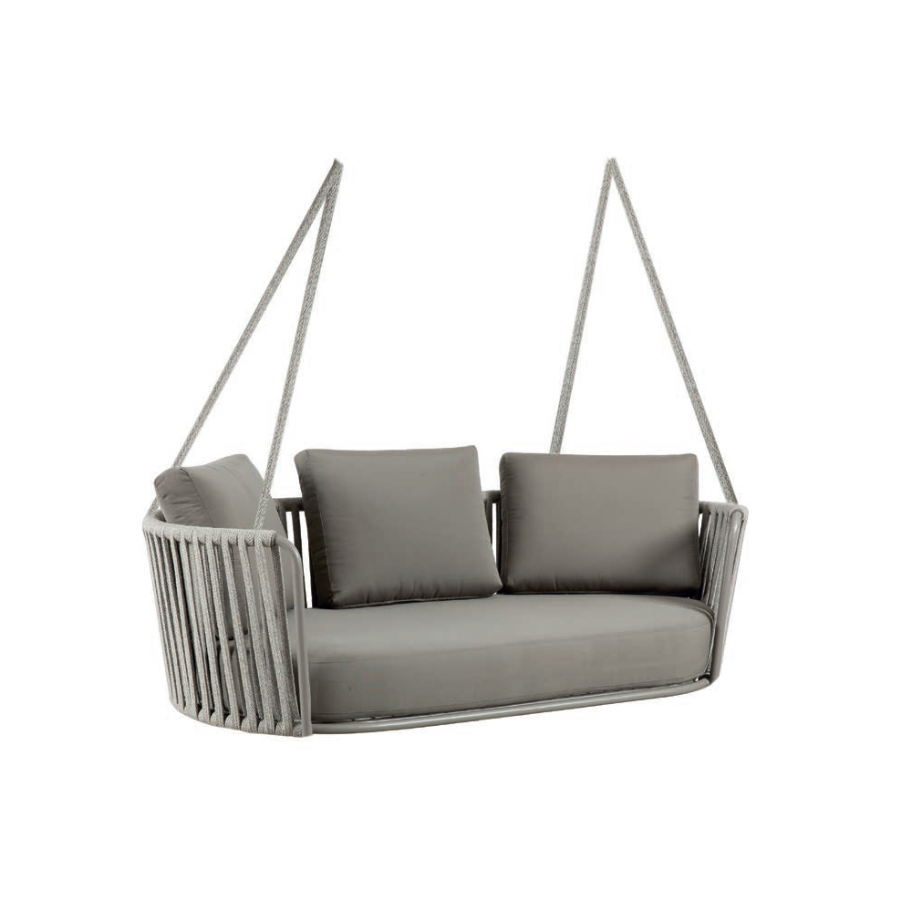 أرجوحة خارجية ذات مقعدين مصنوعة من الحديد المجلفن المطلي بالمسحوق والحبل مع مقعد من القماش صنع في إيطاليا.