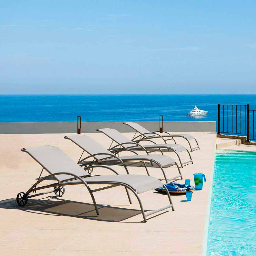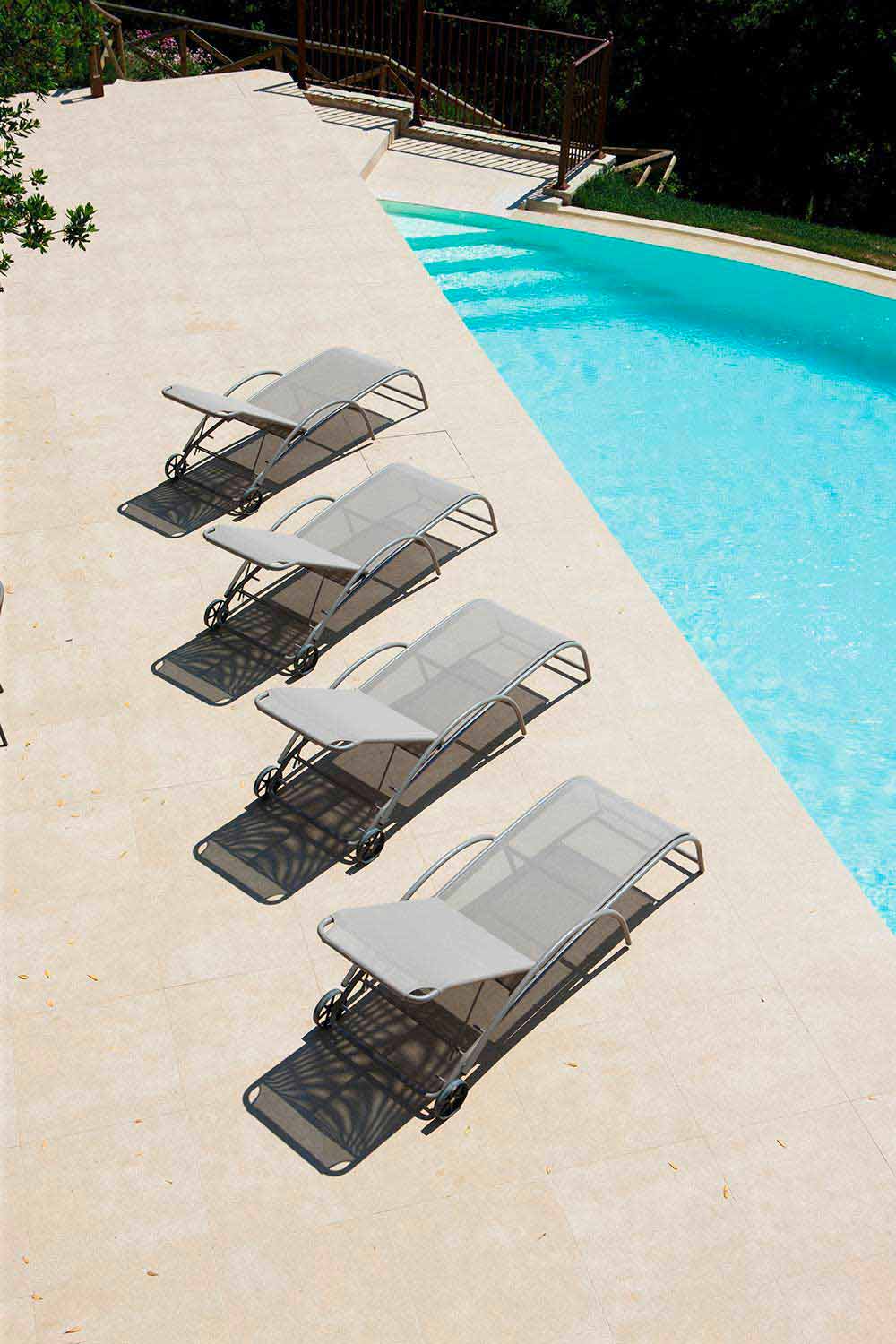 كرسي استرخاء خارجي مصمم من الحديد المجلفن المطلي بالمسحوق والقماش مع عجلات صنع في إيطاليا، قطعتين.