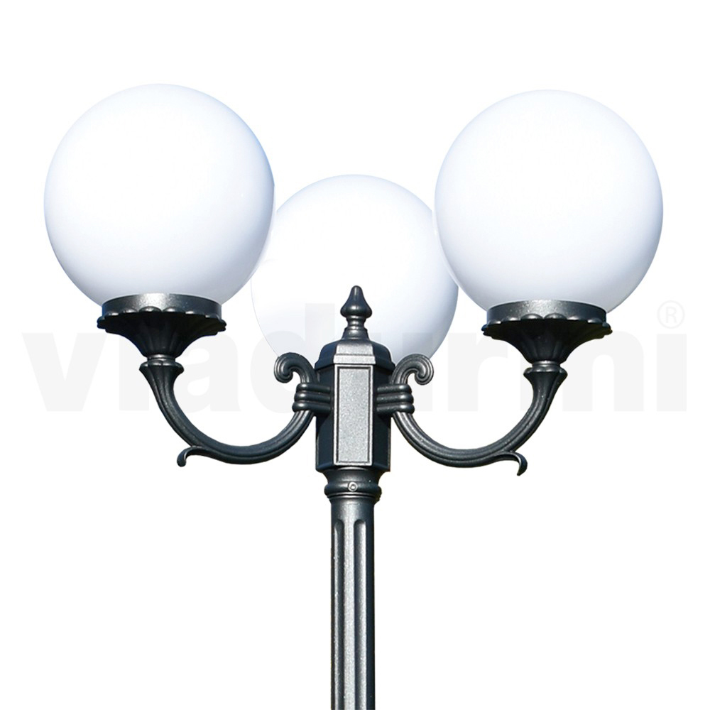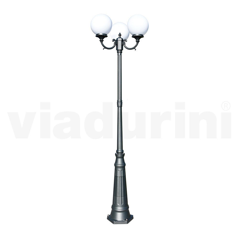 مصباح حديقة مصنوع من هيكل من الألومنيوم المصبوب بلمسة نهائية من أنثراسايت وموزع كروي من الأكريليك الأوبال ، صنع بالكامل في إيطاليا.