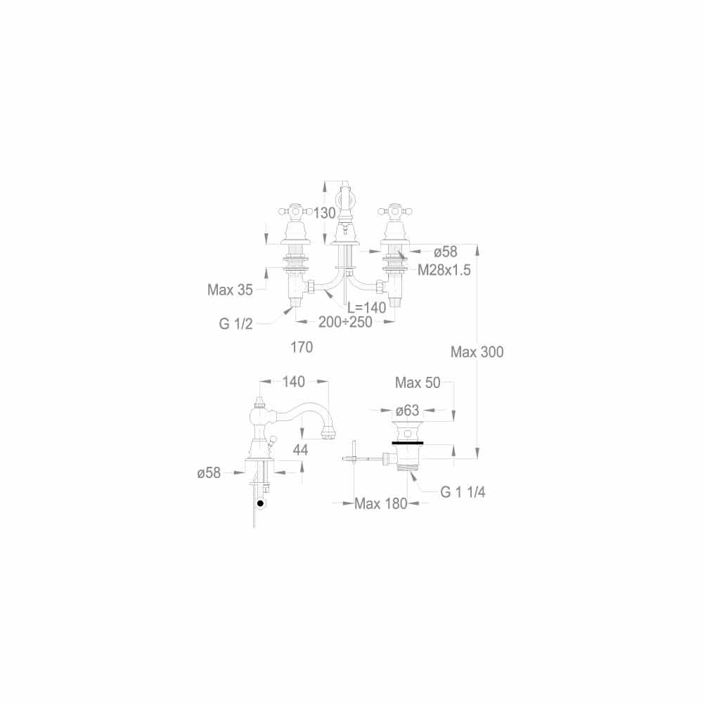خلاط حوض غسيل كلاسيكي بثلاث فتحات مع لمسة نهائية من الكروم النحاسي بارتفاع 130 مم ومسافة مركزية 140 مم مع تصريف ورافعة قابلة للسحب. صُنع بالكامل في إيطاليا بمواد عالية الجودة مطابقة للمعايير الأوروبية. يُمكن تركيب هذا الخلاط في الأعلى، وهو مُجهّز بمُهوّئ ورأس سيراميكي بزاوية 180 درجة؛ يُوصى به لنظام توفير الطاقة الذي يُوفّر 6 لترات/دقيقة من المياه، بالإضافة إلى فوهة دوارة.