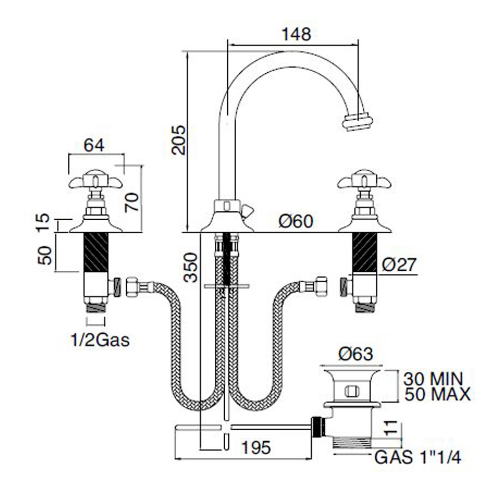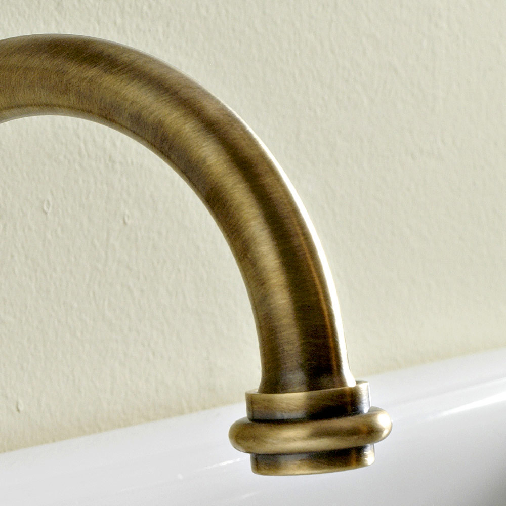 صنبور حوض غسيل ذو فوهة عالية بثلاث فتحات مصنوع يدويًا من النحاس على الطراز الكلاسيكي في إيطاليا.