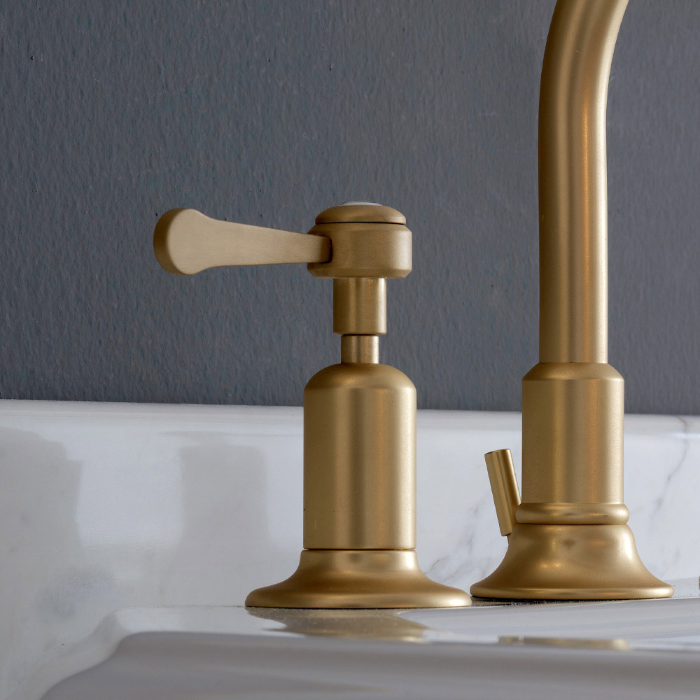 هذا الصنبور الرائع ذو الفوهة العالية ذو الثلاث فتحاتمع تصريف مصنوع بالكامل يدويًا من قبل حرفيين ذوي خبرة في الصناعة من النحاس الثقيل ، مصبوب في قوالب تحترم أنظمة الحرف اليدوية في الماضي ومحمي بطبقة علوية سميكة من النحاس غير اللامع.