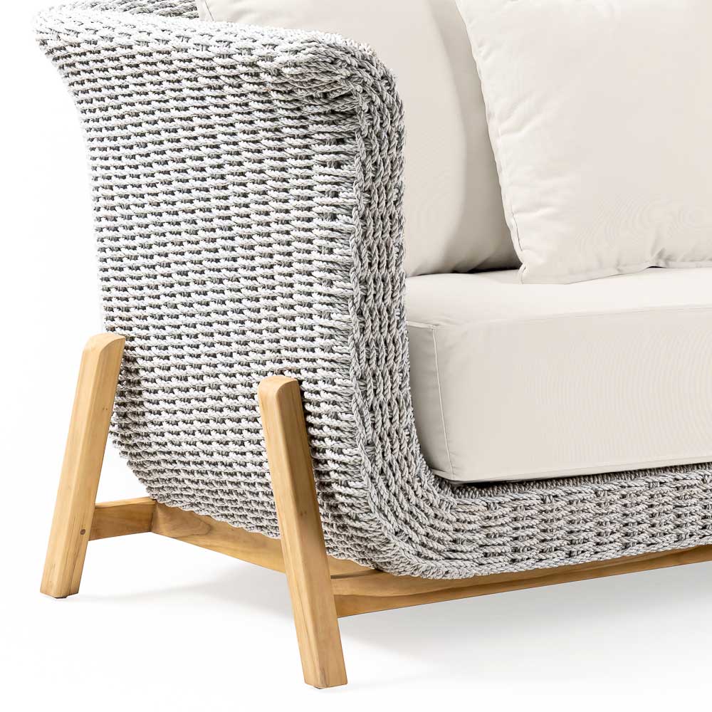 هذه الأريكة الخارجية مصنوعة من هيكل داخلي من الألومنيوم المطلي بمسحوق الإيبوكسي، مع قاعدة من خشب الساج وحبل VRO منسوج يدويًا. مجهزة بمقاعد ووسائد ظهر من القماش المقاوم للماء باللون الرمادي الهافانا .