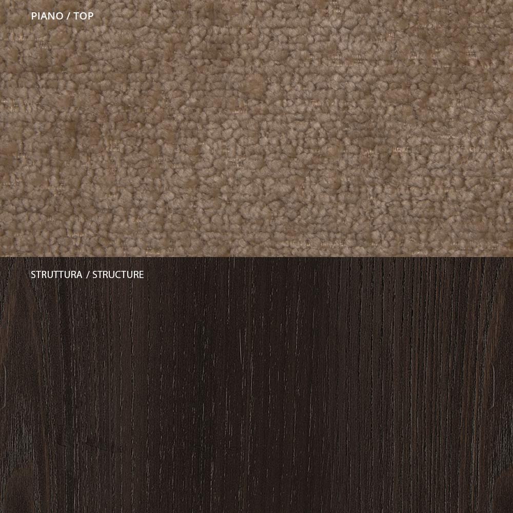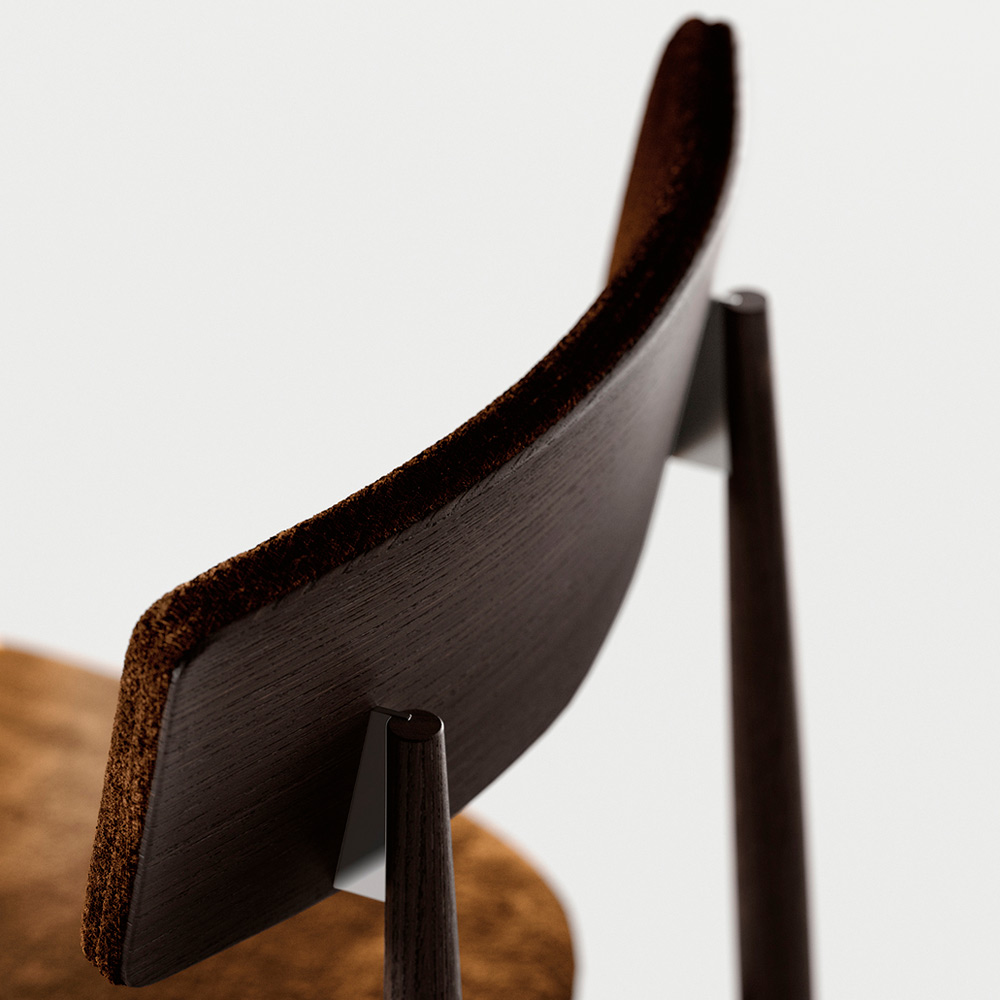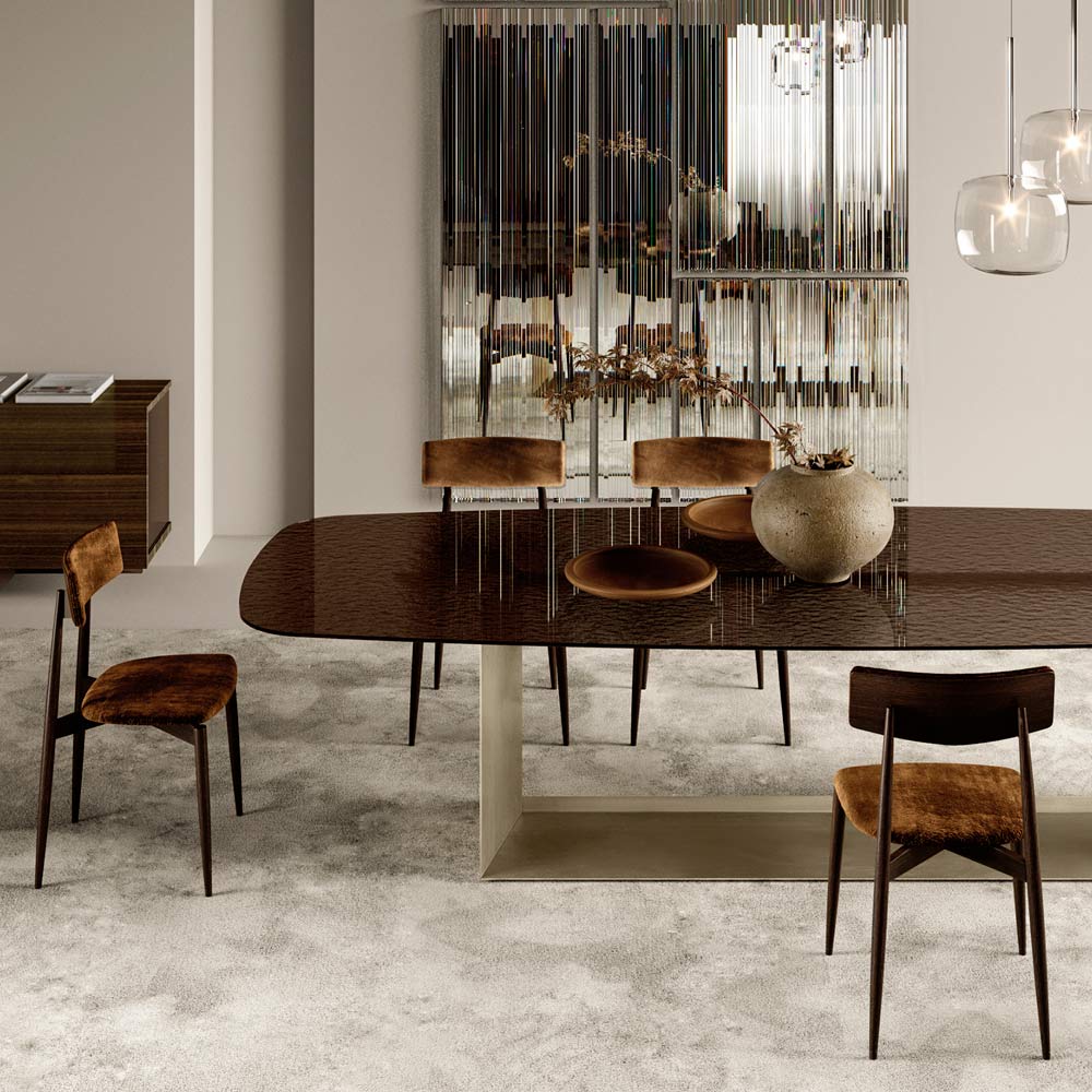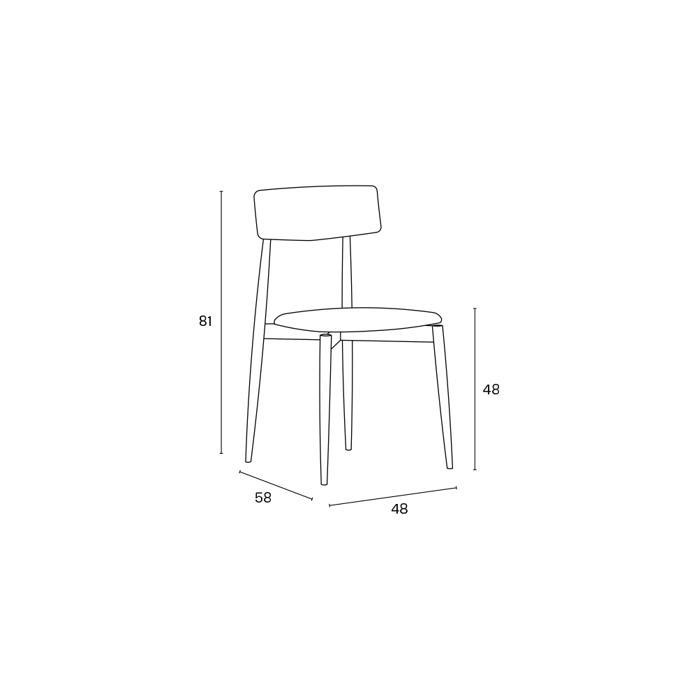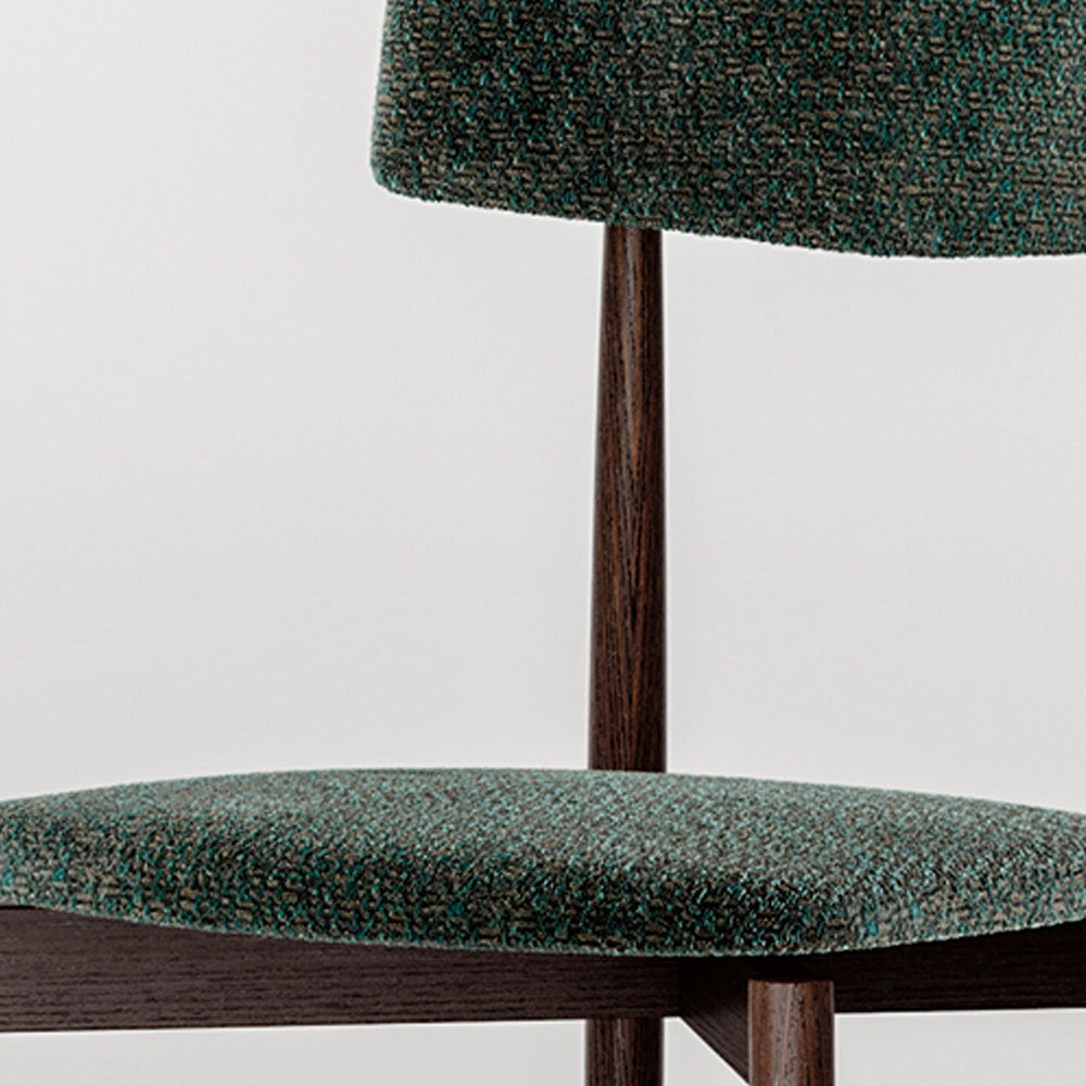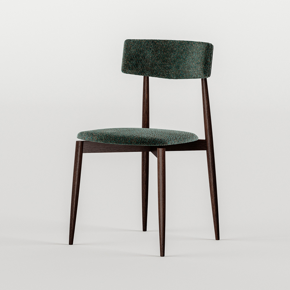 أربعة كراسي معيشة مصنوعة من خشب الدردار المصمت، بمقعد مُصمم ومُبطن، ومُغطى بقماش قابل للإزالة. مسند الظهر مصنوع من خشب مُقوّس ، ومُبطن ومُغطى بقماش من الأمام، مع خياطة خيطية على الحافة. المفصل بين الظهر والهيكل مصنوع من معدن مصقول. عملي ومتعدد الاستخدامات، بفضل الجمع بين العمليات اليدوية الدقيقة واستخدام أحدث الآلات. الاهتمام بالتفاصيل، من التفاصيل المعدنية في الظهر إلى الشكل المميز للأرجل، وصولاً إلى الأقمشة الحصرية، يجعله كرسيًا راقيًا ذا طابع مميز.
