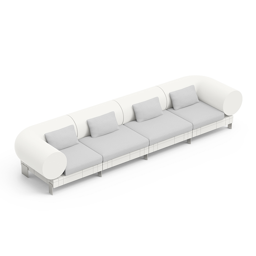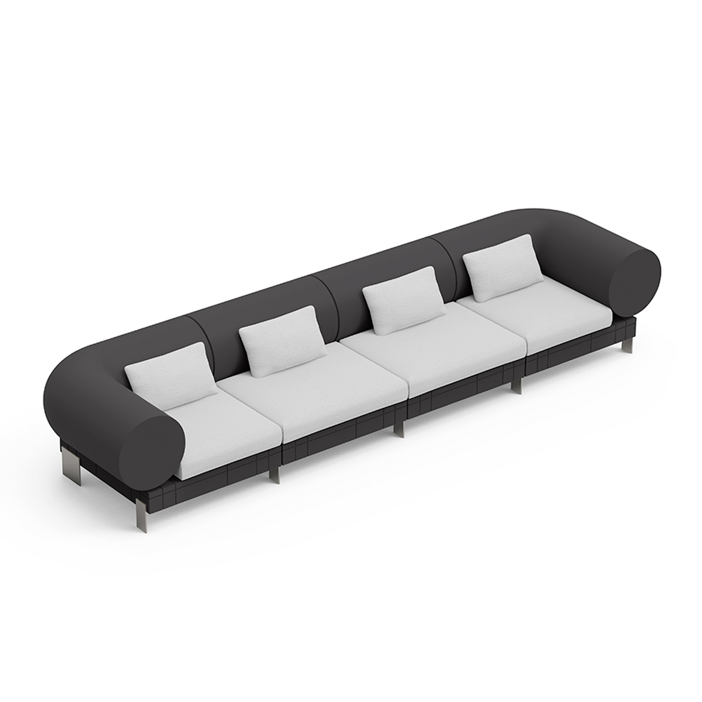أريكة مصنوعة من هيكل البولي إيثيلين ، ووسائد مقعد و 4 وسائد ظهر من قماش Sunbrella وأقدام معدنية.