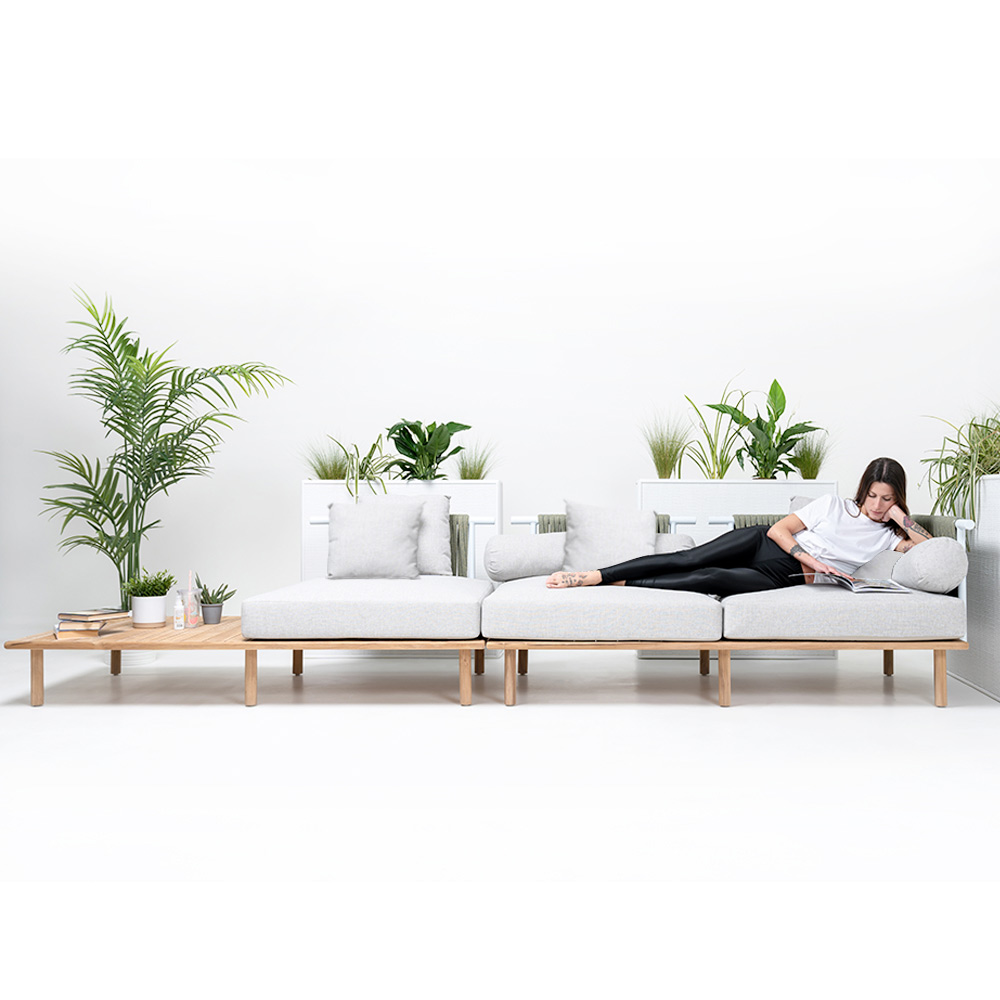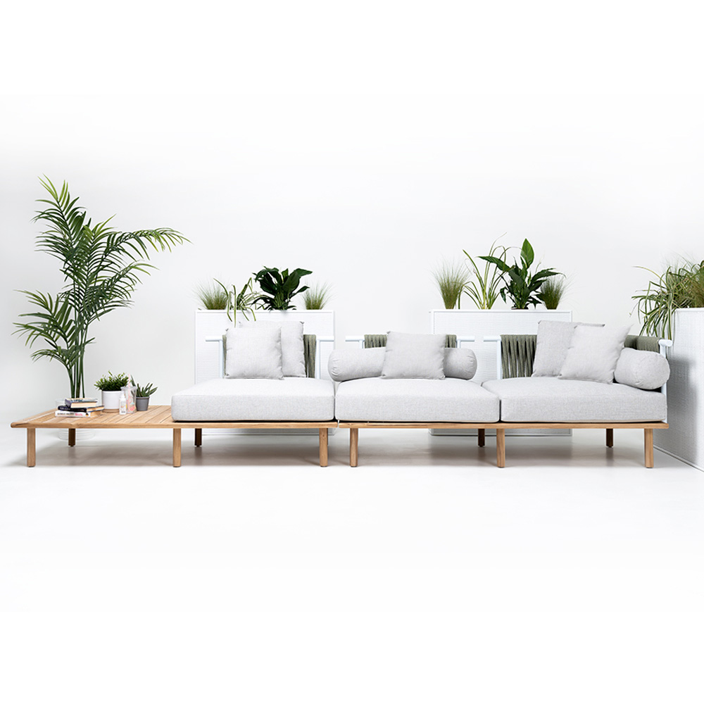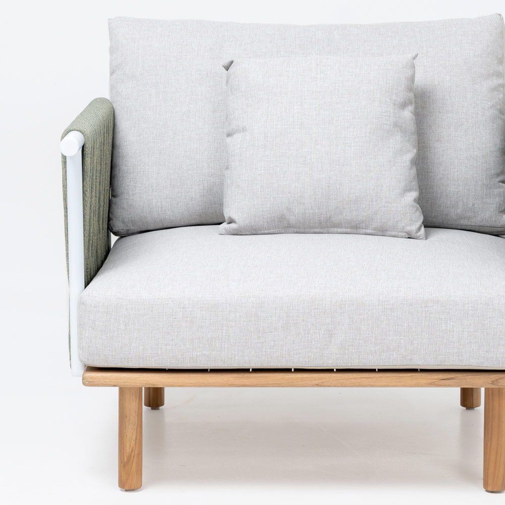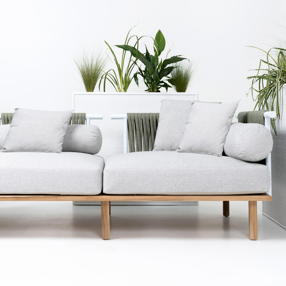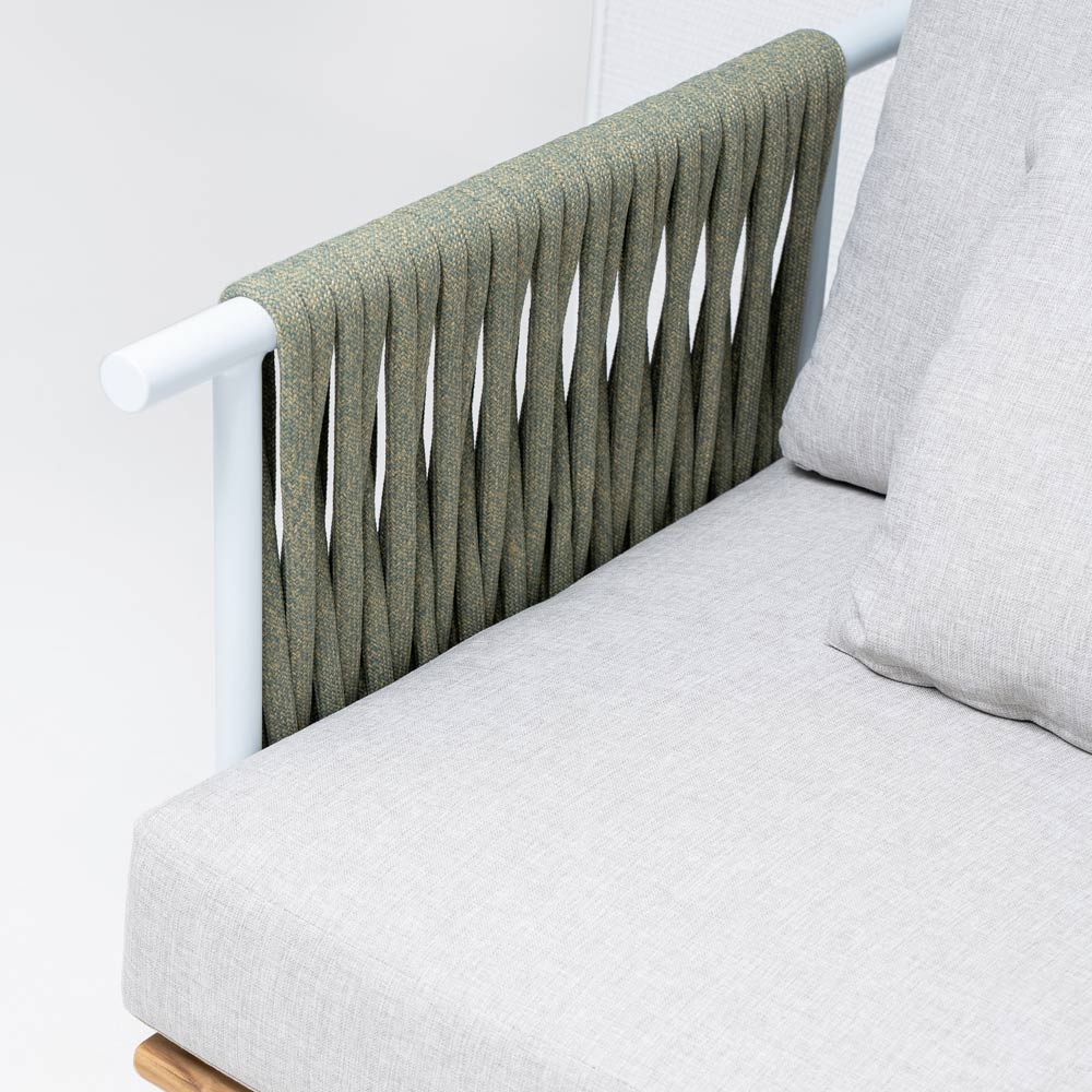 أريكة حديقة معيارية من خشب الساج، ومساند ظهر من الألومنيوم ومنسوجة من الأوليفين/حبل البولي بروبلين والوسائد