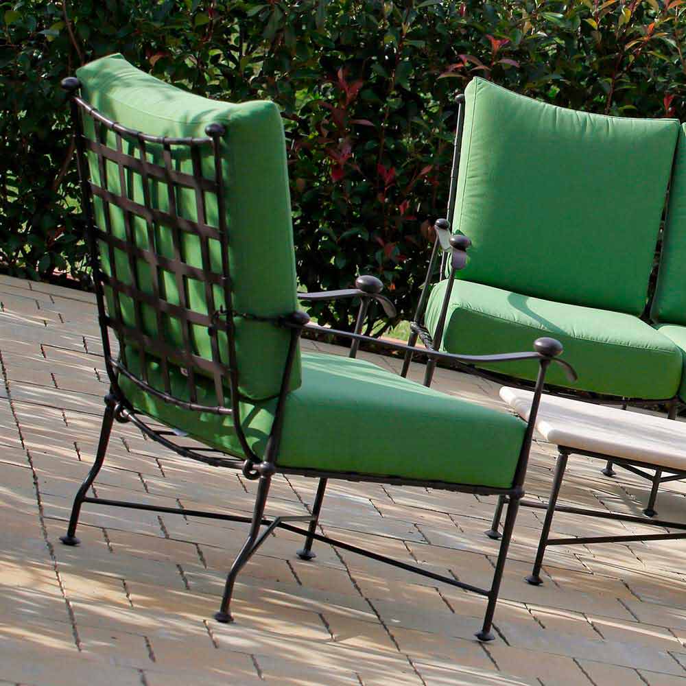 غرفة معيشة خارجية مصنوعة يدويًا من الحديد المطلي مع وسائد مصنوعة في إيطاليا.