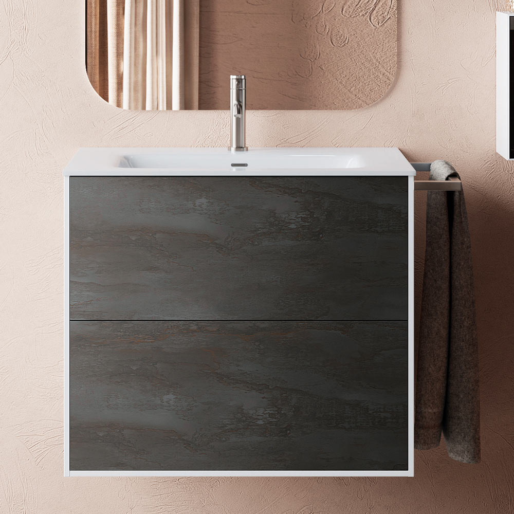 مجموعة حمام متكاملة تشمل حوض غسيلسيراميك أبيض لامع، ومرآة زجاجية مع مصباح ، وقاعدةمن الميلامين المقاوم للخدش بلون أكسيد مع درجين قابلين للسحب بالكامل مع آلية إغلاق ناعمة. يتميز هذا الخزانة للحمام بأسلوب بسيط وعصري، وهو مثالي في بساطته لإكمال ديكور أي حمام، ويلبي مختلف الأذواق والأنماط.