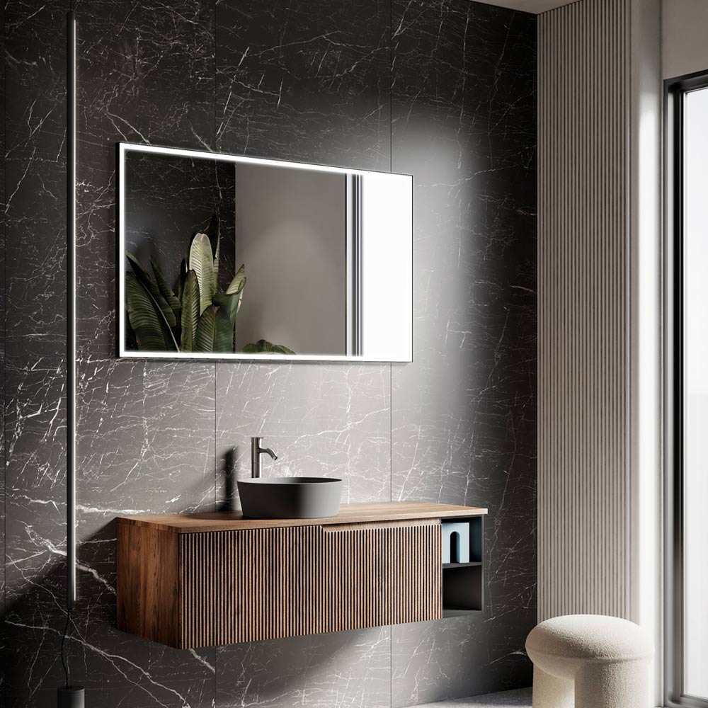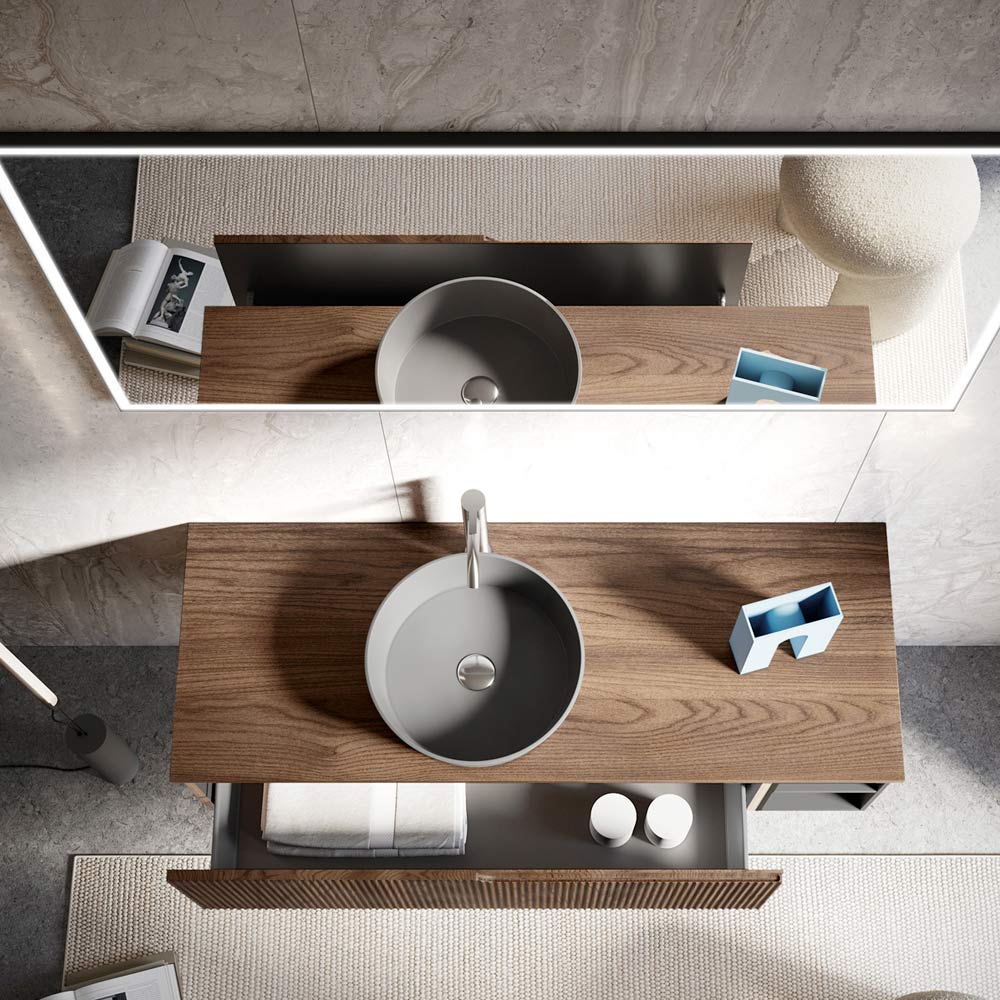 مجموعة حماممصنوعة بالكامل في إيطاليا تتكون من قاعدة بها درج واحد من خشب MDF بتشطيب خشب البلوط كانيتاتو ريو، وعنصر مفتوح من خشب MDF أنثراسيت ناعم، وحوض سيراميك أسود غير لامع، ومرآة بإضاءة LED أمامية وإطار أسود. صُمم هذا الحمام ليجمع بين الأناقة العصرية والعملية، مُلبيًا بذلك احتياجات التصميم المتنوعة ومُضفيًا لمسةً فريدةً على المكان. تُضفي اللمسات النهائية البسيطة والخطوط المستقيمة على هذا التصميم أناقةً وجاذبيةً، مُكملةً بذلك المواد عالية الجودة والمتينة المُستخدمة فيه.
