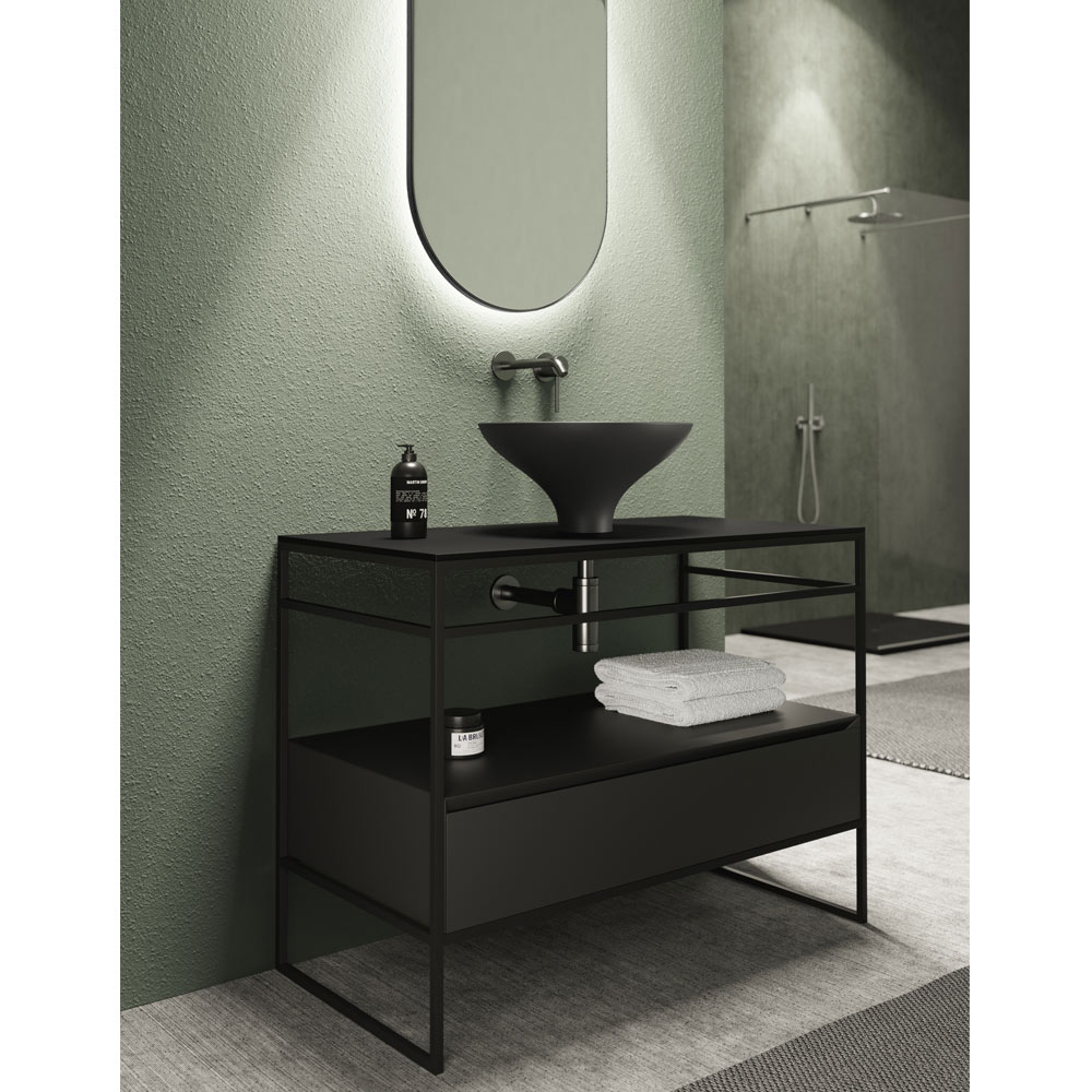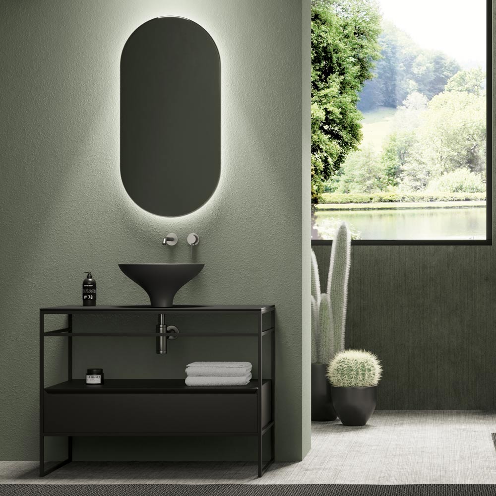 حمام مصنوع بالكامل في إيطاليا ، يتكون من حوض وقاعدة ومرآة. حوض الغسيل ذو المنحنيات المتناسقة مصنوع من السيراميك بلمسة نهائية سوداء غير لامعة، وهو مصمم للأجواء العصرية والمتطورة. قاعدته مصنوعة من الفولاذ المقاوم للصدأ باللون الأسود غير اللامع، وسطحه من السيراميك ، ودرج خشبي بفتحة 45 درجة وإغلاق بطيء. تكتمل هذه المجموعة بمرآة حائط بيضاوية بإضاءة خلفية وإطار من الألومنيوم بلمسة نهائية سوداء غير لامعة .