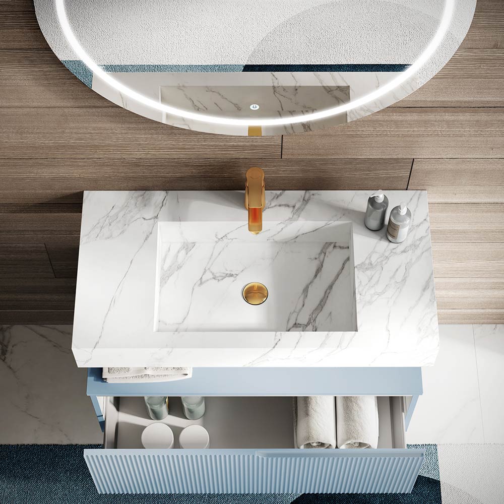 مجموعة حمام من ألواح HPL بلون كالاكاتا وألواح MDF مضلعة بلون تيفاني الأزرق، صنع في إيطاليا