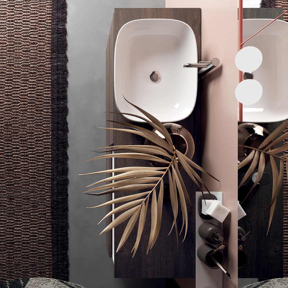 طقم حمام مكون من حوض سيراميك ومرآة وقاعدة مقاومة للخدش باللون البني الداكن ، مصنوع بالكامل في إيطاليا.
