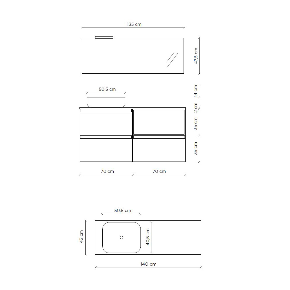القاعدة: الطول 140 سم × العمق 45 سم × الارتفاع 72 سم
