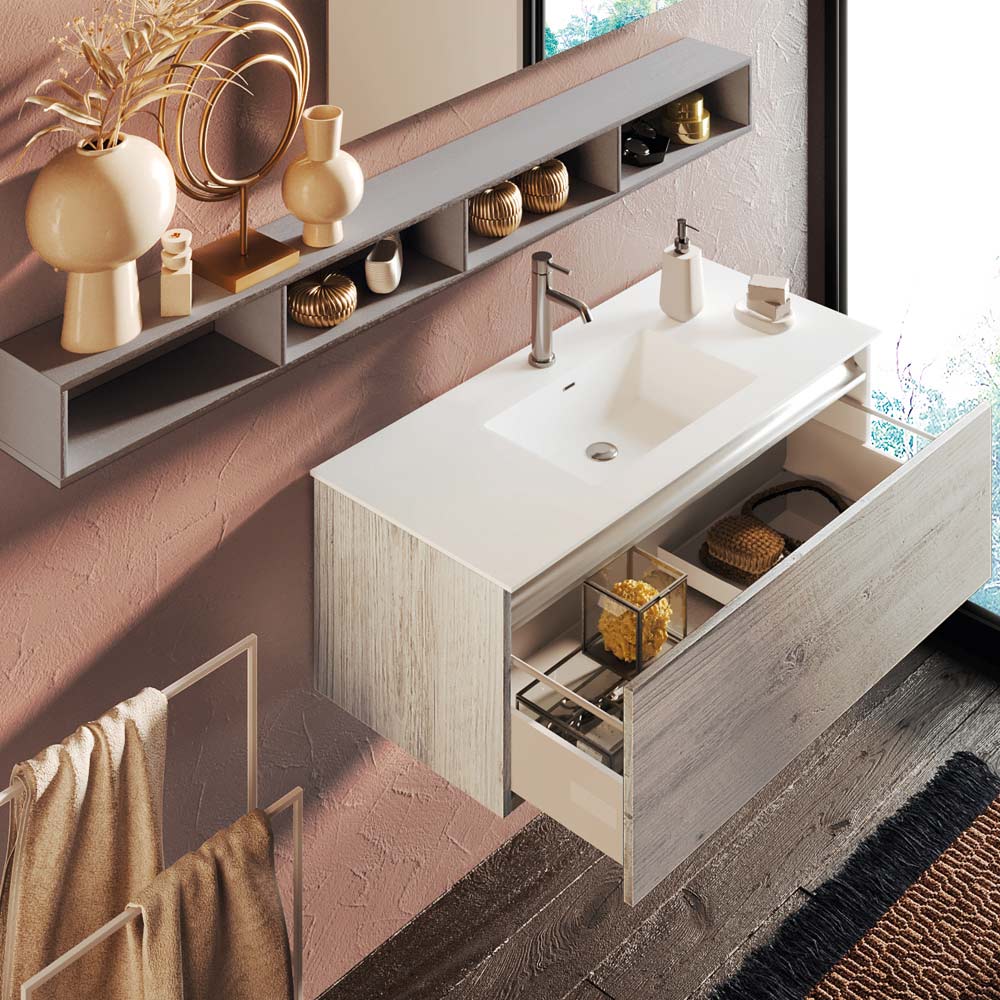مجموعة حمام مع مرآة مزودة بمصباح LED مدمج ، وقاعدة مقاومة للخدش مصنوعة من خشب الصنوبر القطبي مع درج قابل للسحب بالكامل وإغلاق ناعم وحوض غسيل مدمج من السيراميك الأبيض غير اللامع صنع في إيطاليا.