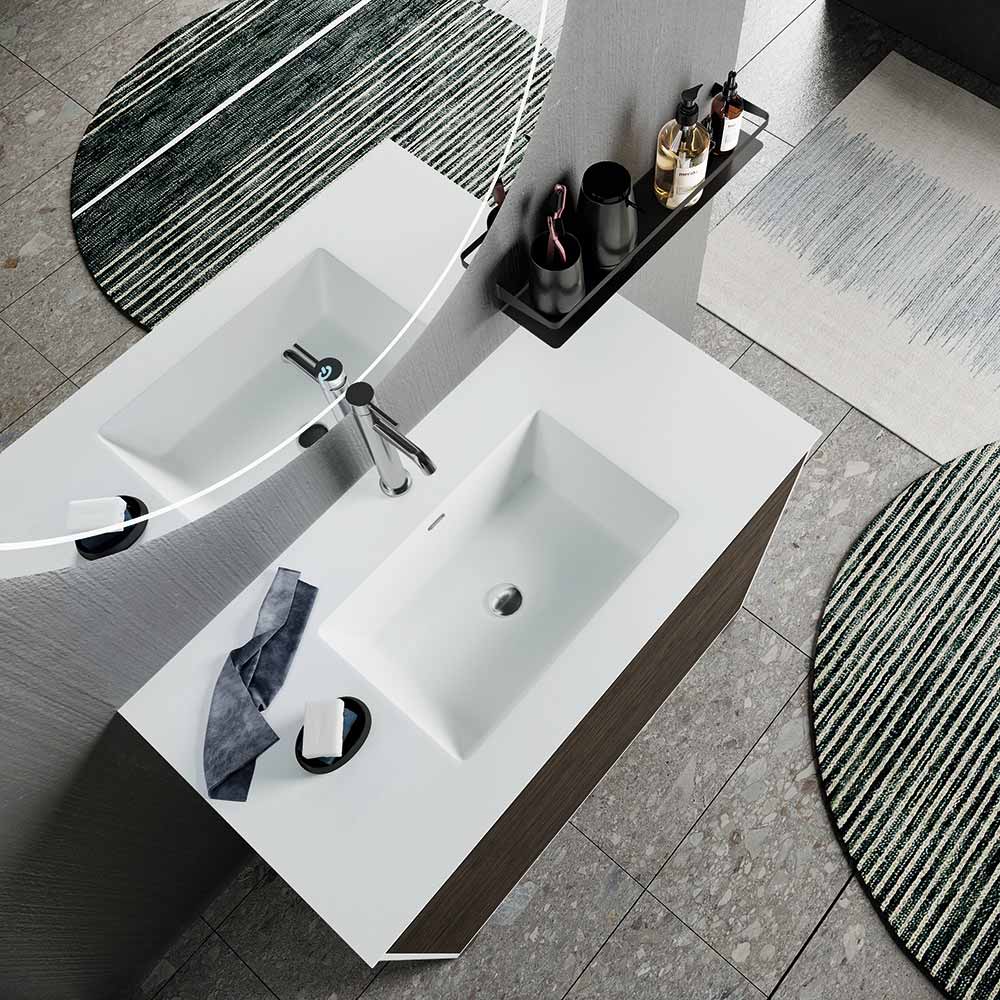 طقم أثاث حمام متكامل يشمل مرآة، وحوض من الراتنج، وقاعدة مقاومة للخدش. صنع في إيطاليا.
