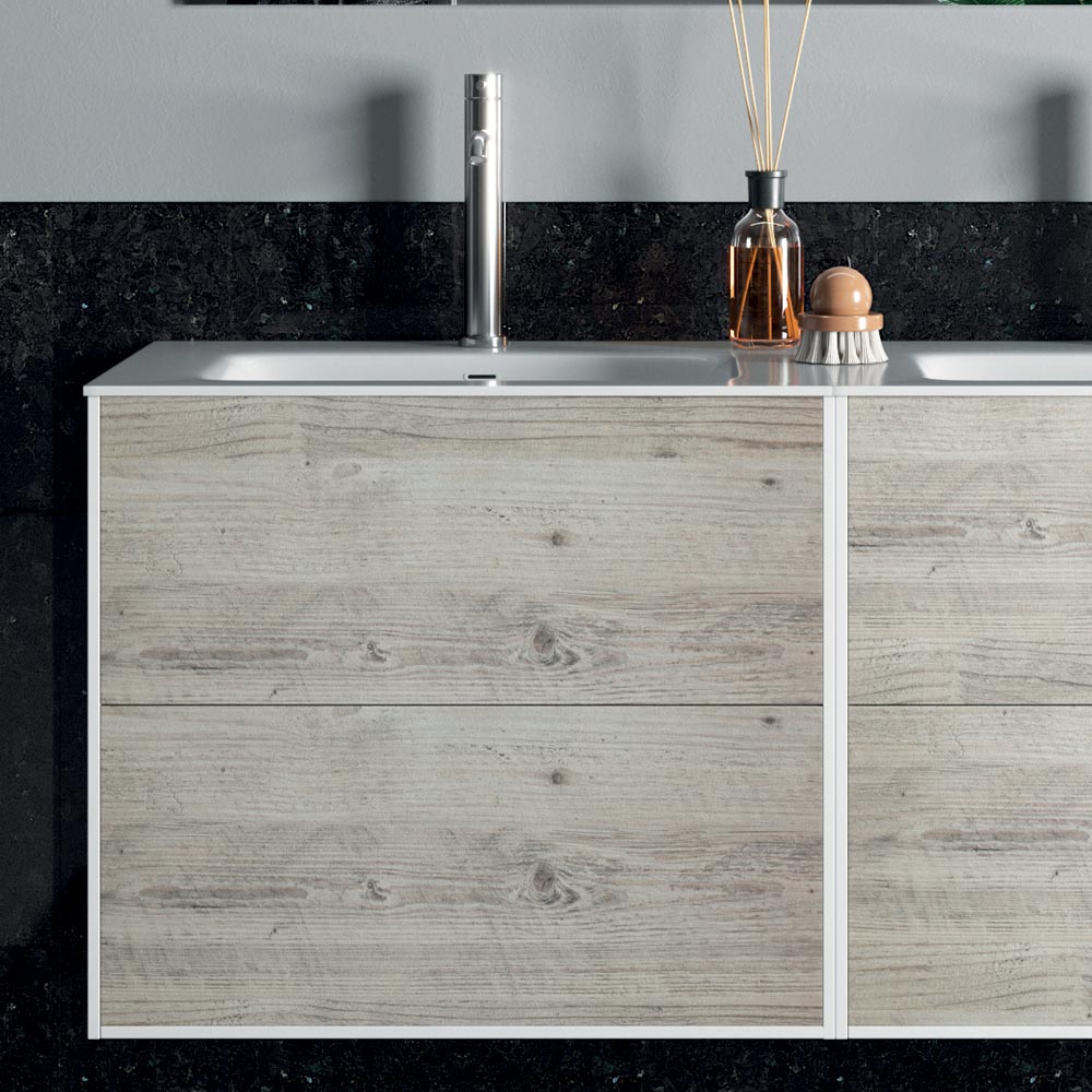 مجموعة حمام متكاملة تشمل حوض غسيل مزدوج من السيراميك ، ومرآة مستطيلة مزودة بإضاءة LED أمامية واحدةوقاعدة من مادة الميلامين المقاومة للخدش بلون الصنوبر القطبي مع 4 أدراج تفتح بالكامل وتغلق بسلاسة. تستحضر مجموعة الأنماط العصرية مفاهيم الخفة والبساطة الجوهرية. تتكامل تفاصيل الهيكل والأدراج التي تعمل بنظام الدفع والسحب بأناقة فائقة، مما يمنح الهيكل القدرة على التكيف مع كل حاجة.