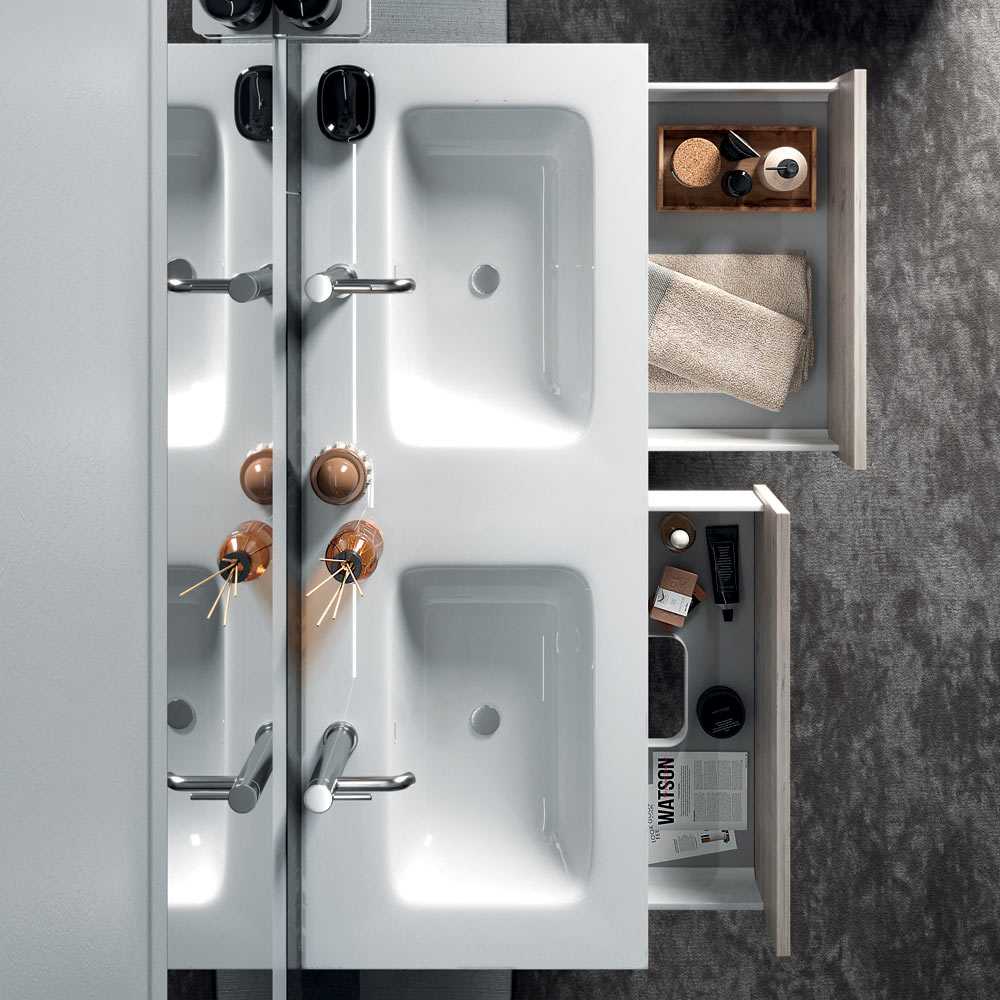 مجموعة حمام متكاملة مع مرآة، وحوض سيراميك مزدوج، وقاعدة مصنوعة في إيطاليا.