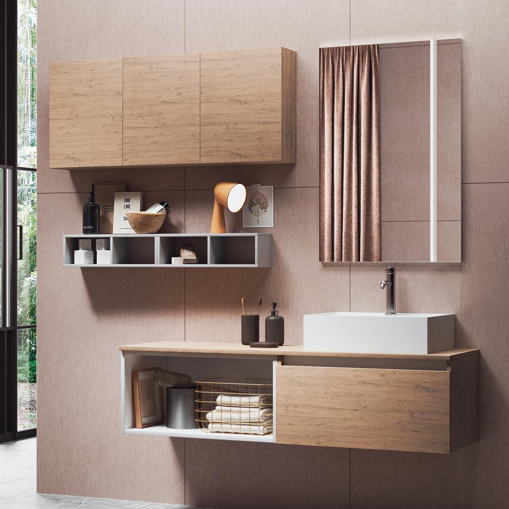 مجموعة حمام تتضمن حوض غسيل بسطح من السيراميك الأبيض ، ومرآة بإطار من مادة ABS مزودة بإضاءة LED أمامية، وقاعدة معلقة من مادة الميلامين المقاومة للخدش بلمسة نهائية من خشب البلوط العسلي. مزود بدرج قابل للسحب بالكامل وآلية إغلاق ناعم ووحدة حائط مفتوحة باللون الأبيض اللامع.