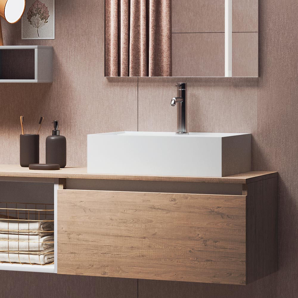 تتكامل الخطوط الجريئة والنظيفة في هذا المنتج لتضفي على الحمام لمسةً راقيةً وأنيقة. ولا تتنازل هذه المجموعة عن الوظائف العملية، بفضل حجرة التخزين والدرج العملي، والمواد المختارة بعناية لتصنيعها.