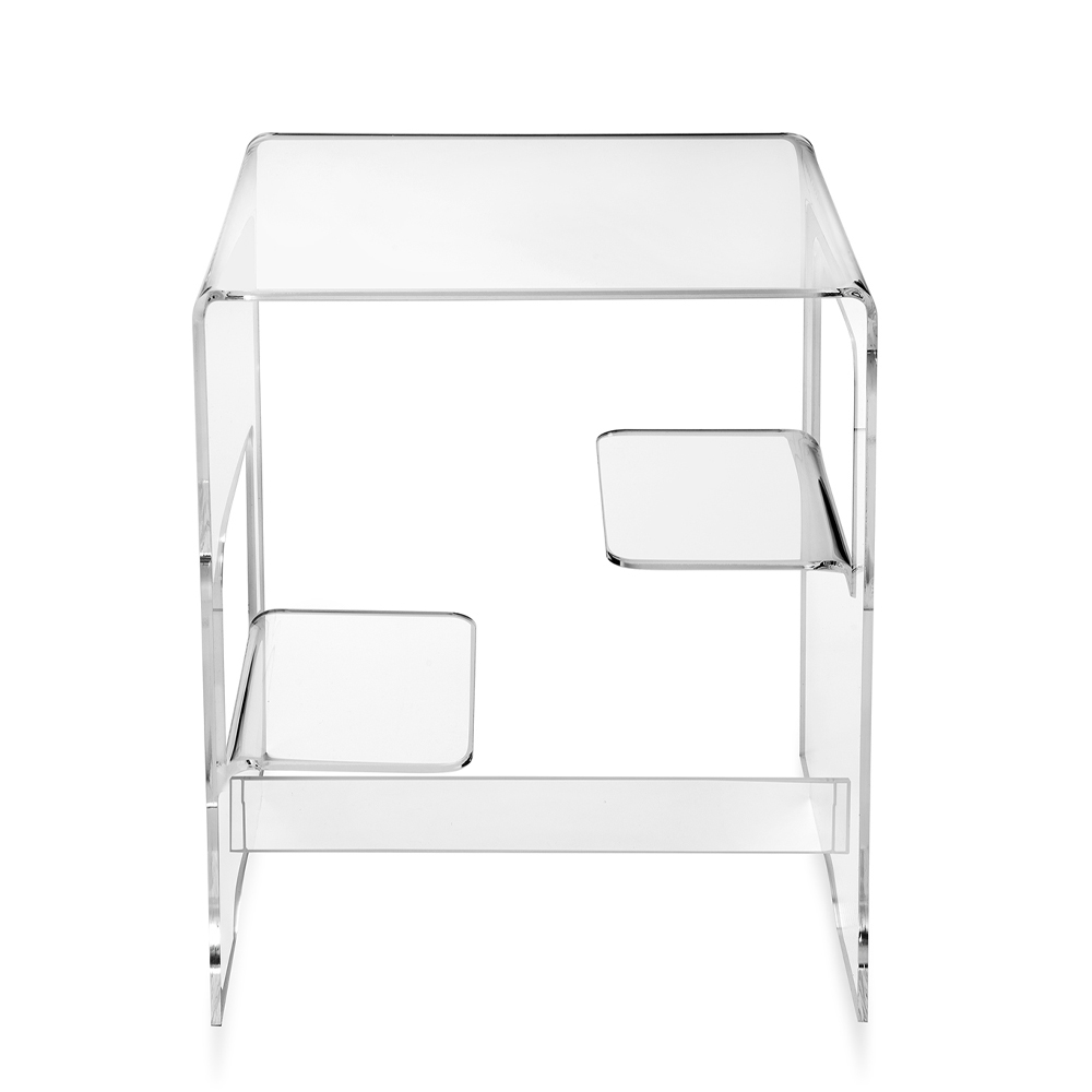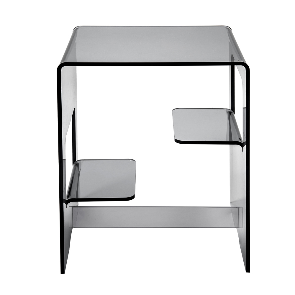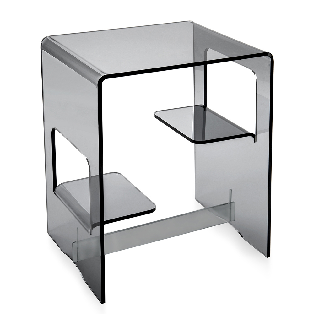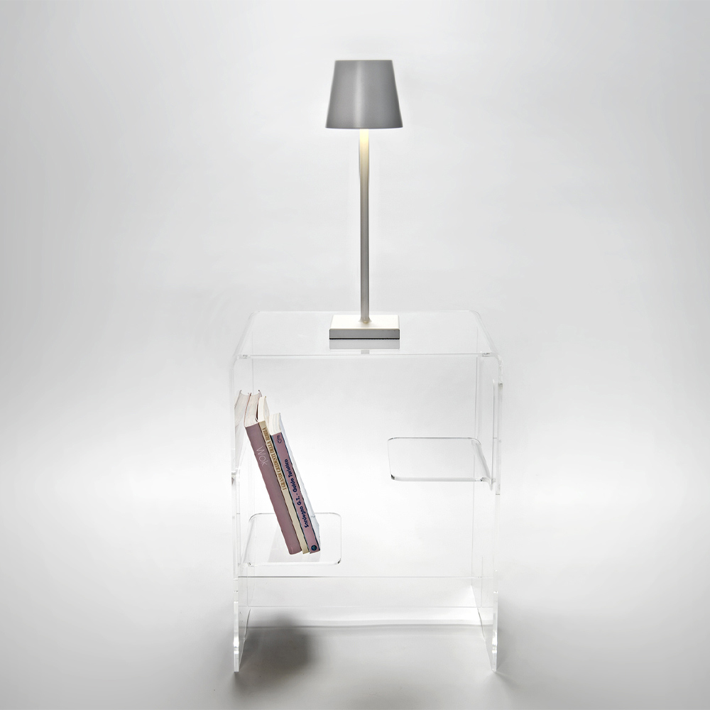 قطعة أثاث عملية ومتعددة الاستخدامات يمكن وضعها في غرفة النوم كطاولة بجانب السرير أو في غرفة المعيشة كطاولة قهوة . إن الشفافية والخطوط الأساسية التي تميزها تحدد تصميمًا عمليًا وحديثًا بفضل الرفين اللذين يمكن استخدامهما كحاملين للأشياء. مصنوع من زجاج شبكي PMMA بنسبة 100% من البوليمر البكر الذي يضمن سطوعًا وتألقًا ثابتًا وغير متغير بمرور الوقت.