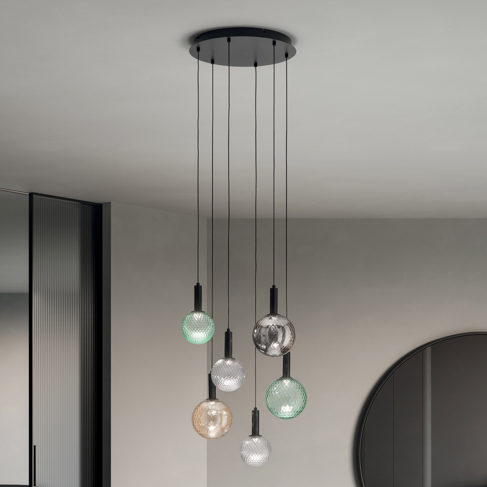 مثالية فوق طاولة طعام أو كنقطة محورية في غرفة معيشة عصرية ، كل كرة مُعلّقة بدقة، مما يُشكّل تركيبة فنية وعملية في آنٍ واحد. تُضفي لمسات الزجاج المختلفة لمسةً من الرقي والتميز على أي مساحة، عاكسةً الضوء بطرقٍ تجذب الانتباه وتُنير الغرفة.