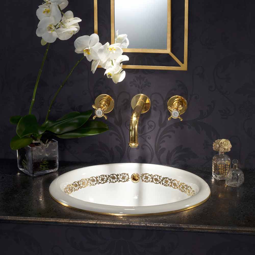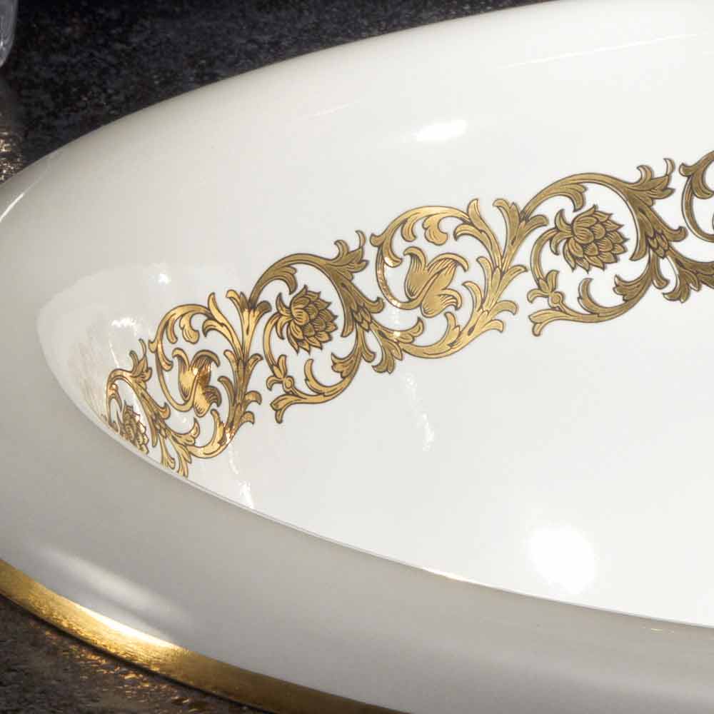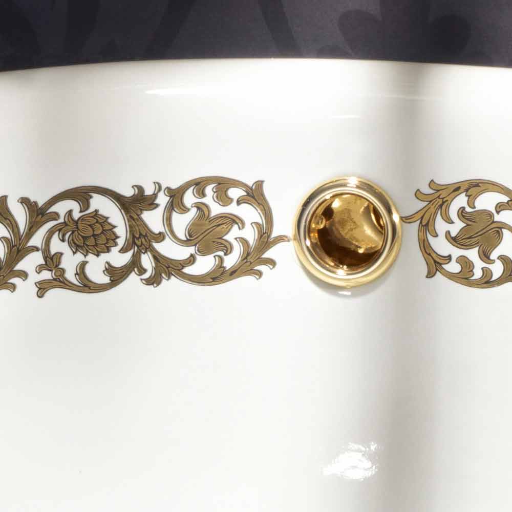 حوض حمام مدمج بتصميم باروكي مصنوع في إيطاليا، أوتيس حوض غسيل مدمج للحمام مصنوع في إيطاليا من طين النار المصنوع يدويًا والمزين بشريط من مخروط الصنوبر الذهبي وحافة من الذهب عيار 24 قيراطًا.