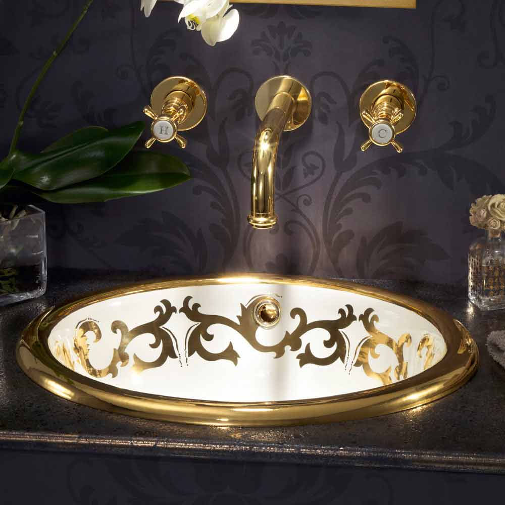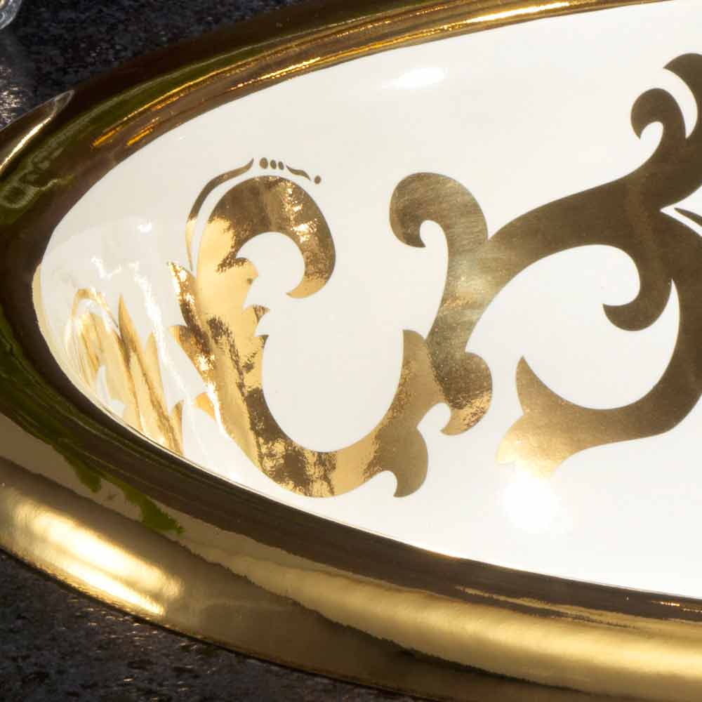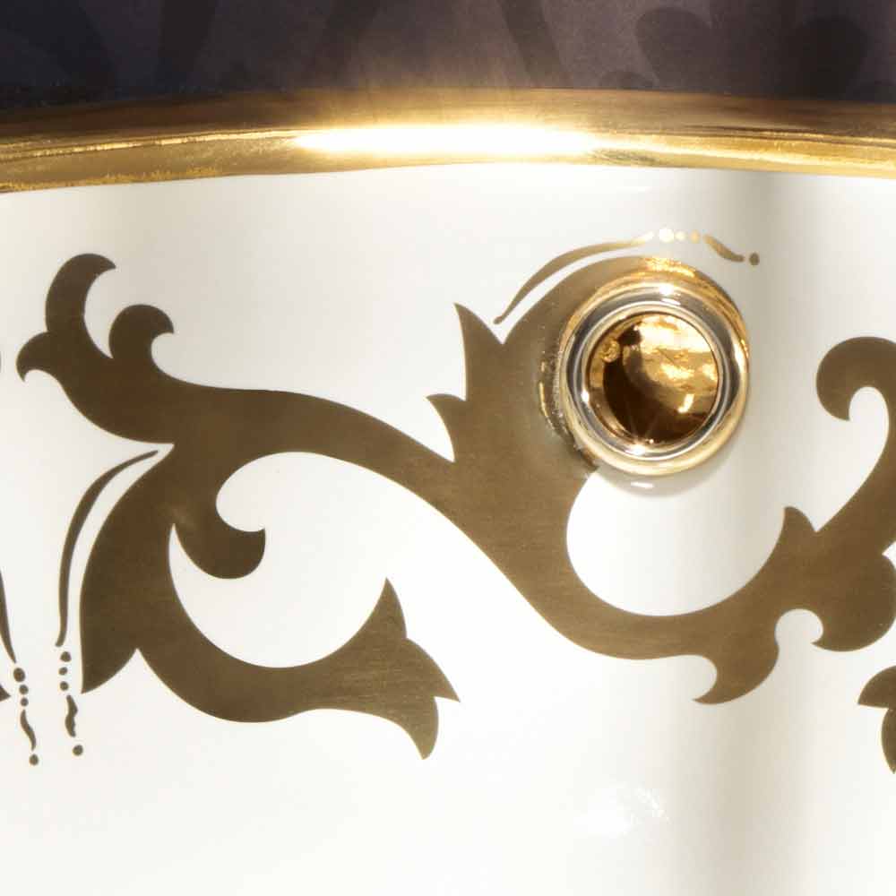 حوض حمام مدمج من الطين الناري والذهب صنع في إيطاليا، أوتيس حوض حمام مدمج مصنوع في إيطاليا من طين النار المصنوع يدويًا، ومزين بتطريز ذهبي وحافة كاملة مطلية يدويًا بالذهب عيار 24 قيراطًا.