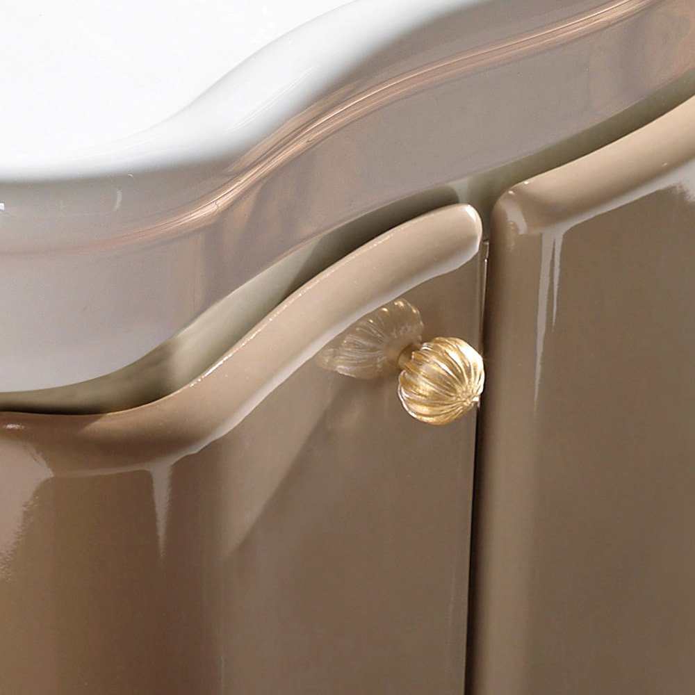 خزانة حمام من خشب MDF ببابين ودرج مطلي بلون الكراميل اللامع، بهيكل عاجي ، مع حوض من السيراميك الأبيض .مقابض نحاسية وحوض غسيل متضمنان.