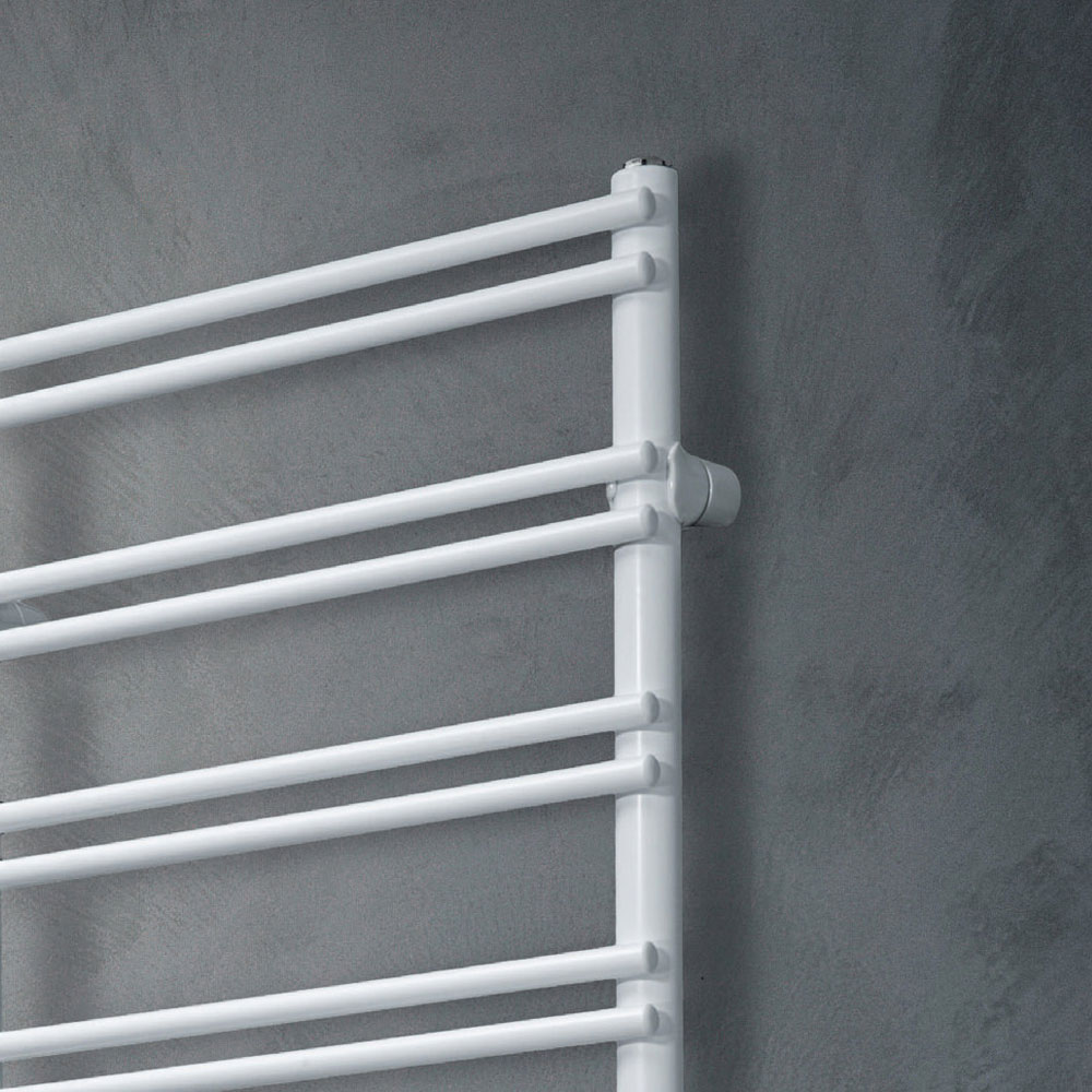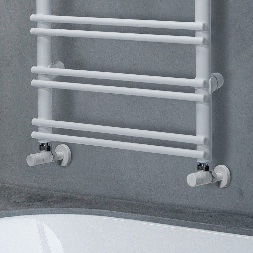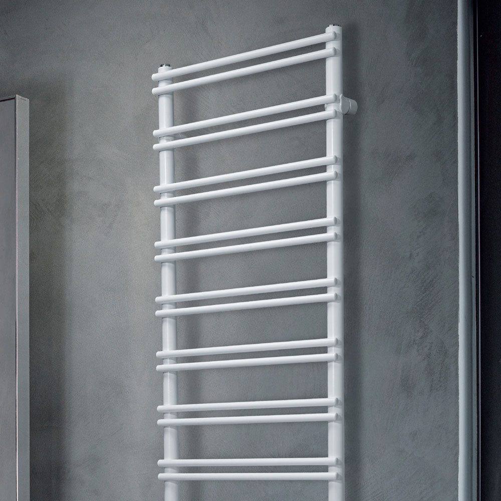 سخان مناشف هيدروليكي من الفولاذ الكربوني بلمسةنهائية بيضاء لامعة، يتكون من سلسلة من العناصر الأفقية بقطر 1.6 سم، ملحومة على مشعبات رأسية بقطر 3.5 سم. صُنع بالكامل في إيطاليا، ويشمل طقم التثبيت على الحائط، وصمام التهوية، وسدادة الستارة . يجمع هذا المنتج بين التكنولوجيا والطابع الرسمي، ليصبح قطعة تصميمية حقيقية، مصدرًا للرفاهية والمتعة الجمالية . إنه أكثر من مجرد مصدر حرارة، بل هو قطعة أثاث قادرة على إضفاء طابع شخصي على البيئات وإكمالها. يتوازن التصميم والوظيفة معًا ليقدما عنصرًا ليس جميلًا فحسب، بل عمليًا وعمليًا أيضًا.
