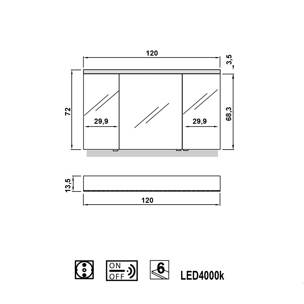 خزانة مرآة كارول مع 3 أبواب وأضواء LED. خزانة مرآة حمام بثلاثة أبواب وإضاءة LED. يُضفي خط إضاءة رفيع إضاءة أمامية مثالية، يمكن التحكم بها بسهولة بواسطة مستشعر. مع مقابض الكروم. إطار الخزانة مصنوع من مادة فينيكس، وهي مادة بوليمرية مُعالجة بتقنية النانو، مما يجعل سطحها مقاومًا للماء والبقع، وناعم الملمس. مزود بمفتاح وقابس. تتوفر كارول بالتشطيبات التالية: - فينيكس الأبيض - فينيكس بني بيفر - فينيكس رمادي مدخن افتح القائمة المنسدلة الموجودة بجوار صور المنتج وحدد اللمسة النهائية المختارة. ضوء LED: 4000k (مرفق) الطاقة: 42 واط لومن: 3920 لومن