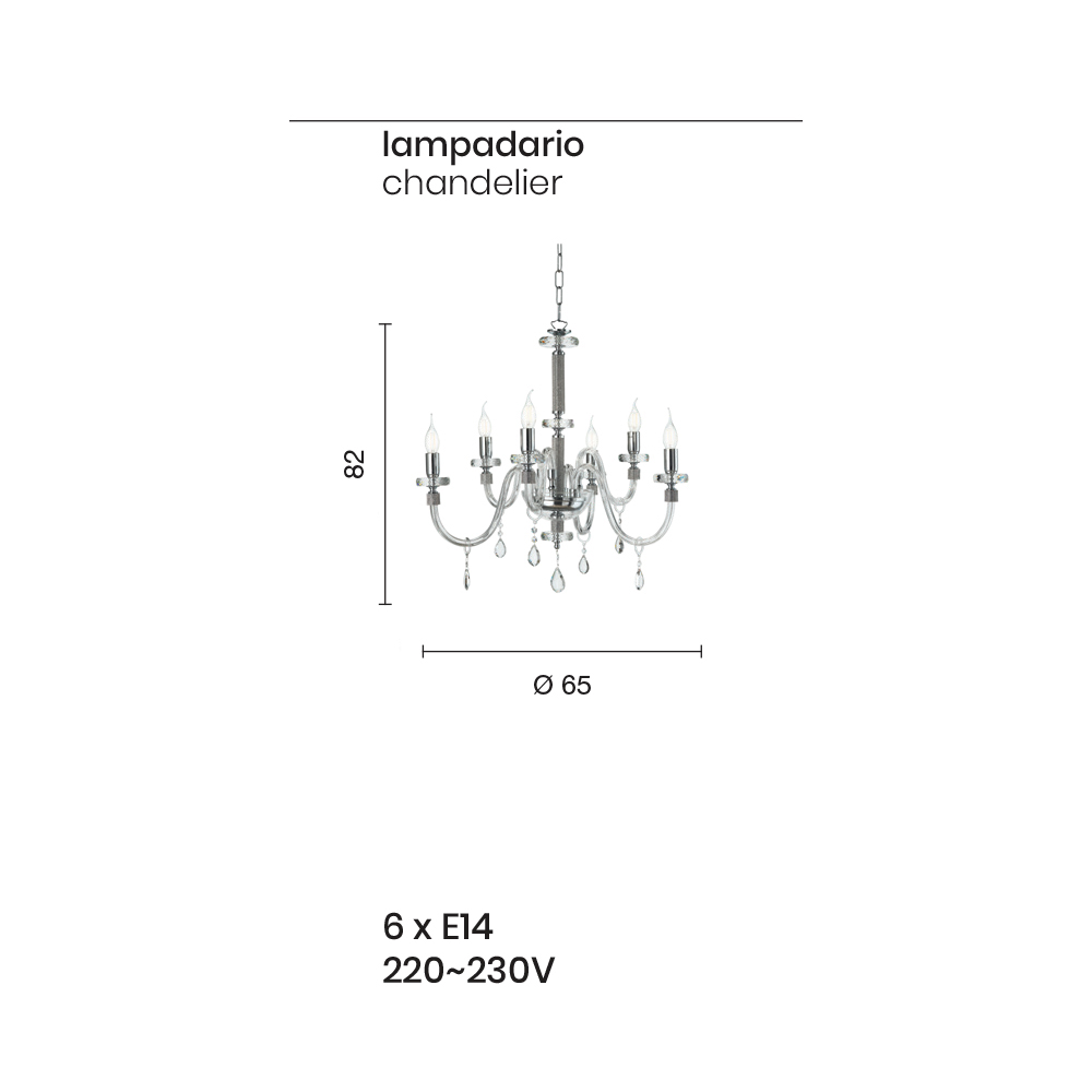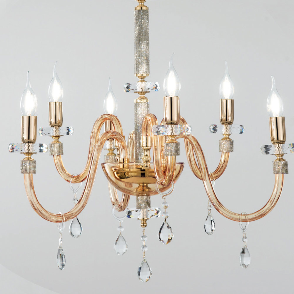 تتكون هذه الثريا ذات الطراز الكلاسيكي من 6 أذرع مقوسة مصنوعة من الزجاج المصنوع يدويًا في إيطاليا، وتأثير "ريغاتون" العنبر، والتي تحيط نهايتها بريق مثبت في المعدن، بالإضافة إلى الجزء المركزي من المكمل، حيث يدعم قرصان دائريان أنبوبيان الهيكل المتخلل مع قرصين دائريين بأحجام مختلفة مصنوعين من الكريستال المقطوع.