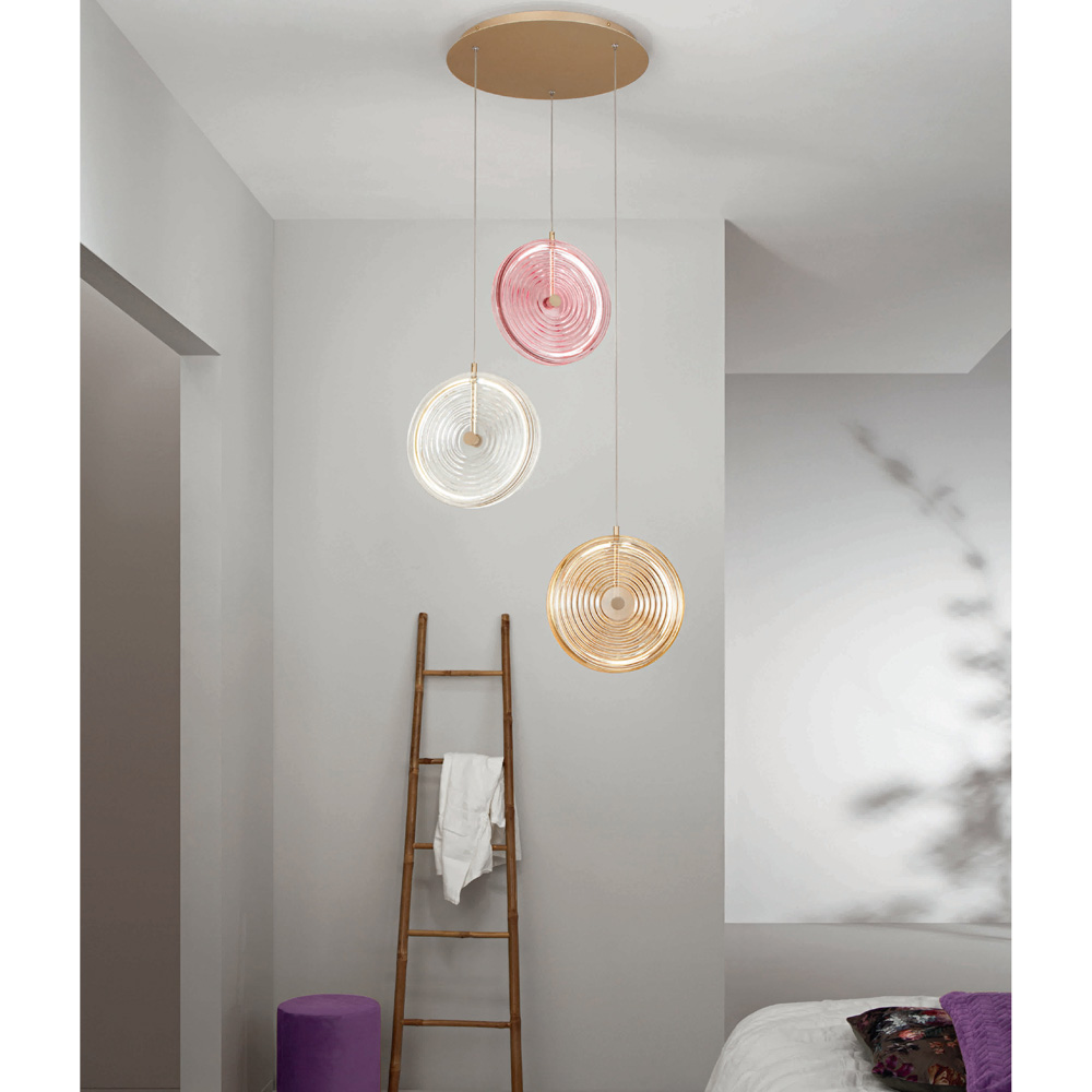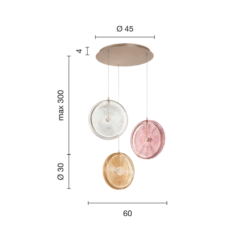 ثرياتم تصنيعها بالكامل في إيطاليا مصنوعة من معدن مطلي بالذهب،وزجاج مزين بخطوط متحدة المركز باللون الكهرماني والوردي والشفاف مع ضوء LED قابل للتعديل وكابل قابل للتعديل في الطول. يهدف هذا المنتج إلى تعزيز التقاليد من خلال نهج عصري ، حيث تجتمع الأناقة والرقي والابتكار لابتكار تصاميم جديدة تُضفي على أي بيئة لمسةً من الذوق الرفيع والطابع المميز. ومن أبرز مميزاته تميز الأشكالوجودة المواد المستخدمةوتميز مصدر الإضاءة .