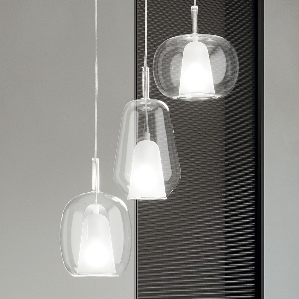 ثريا مصنوعة من قاعدة سقف معدنية بيضاء وموزعات من الزجاج المنفوخ ، تتميز بطبقتين: داخلية من زجاج الساتان وخارجية من الزجاج الملون . غطاء من مادة بوليمرية لتثبيت الكابل في موضع مركزي. كابلات قابلة للتعديل بطول أقصى يصل إلى ٢٥٠ سم.