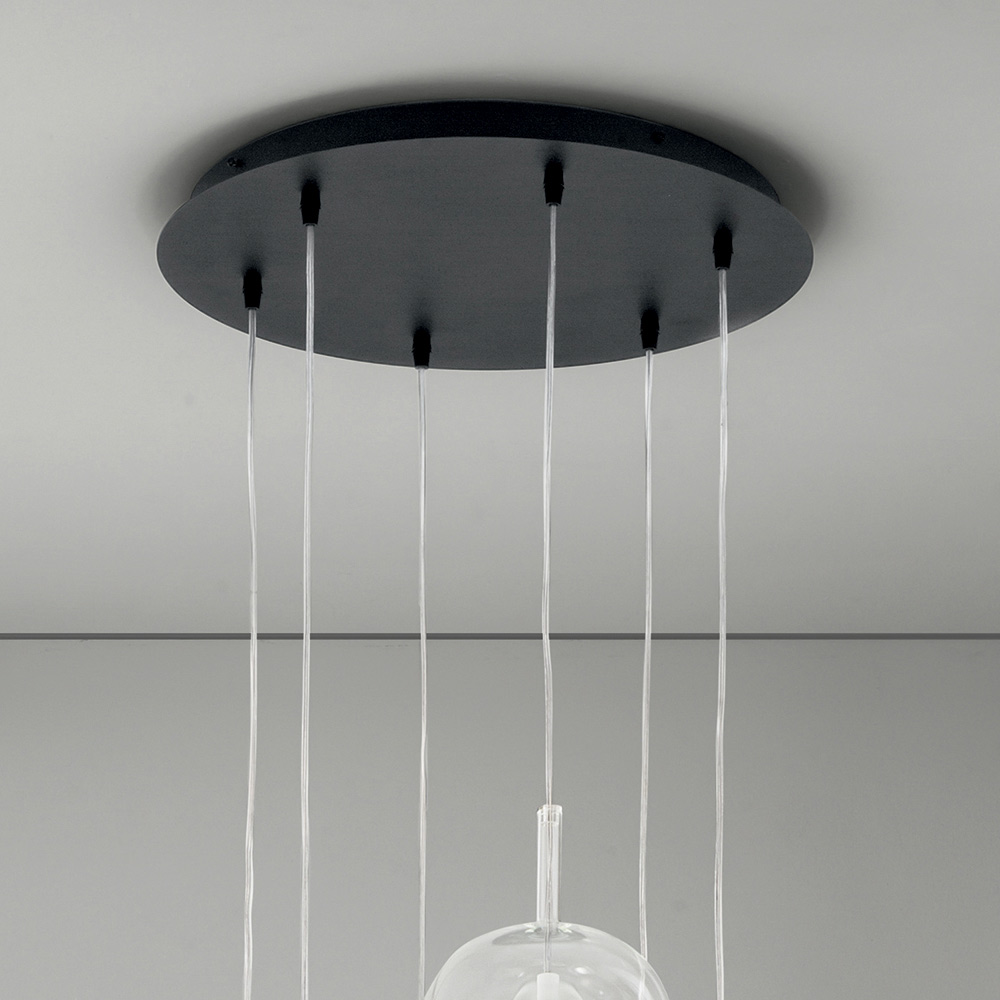 ثريا مصنوعة من قاعدة سقف معدنية سوداء وموزعات من الزجاج المنفوخ ، تتميز بطبقتين: داخلية من زجاج الساتان وخارجية من الزجاج الملون . غطاء من مادة بوليمرية لتثبيت الكابل في موضع مركزي. كابلات قابلة للتعديل بطول أقصى يصل إلى ٢٥٠ سم.