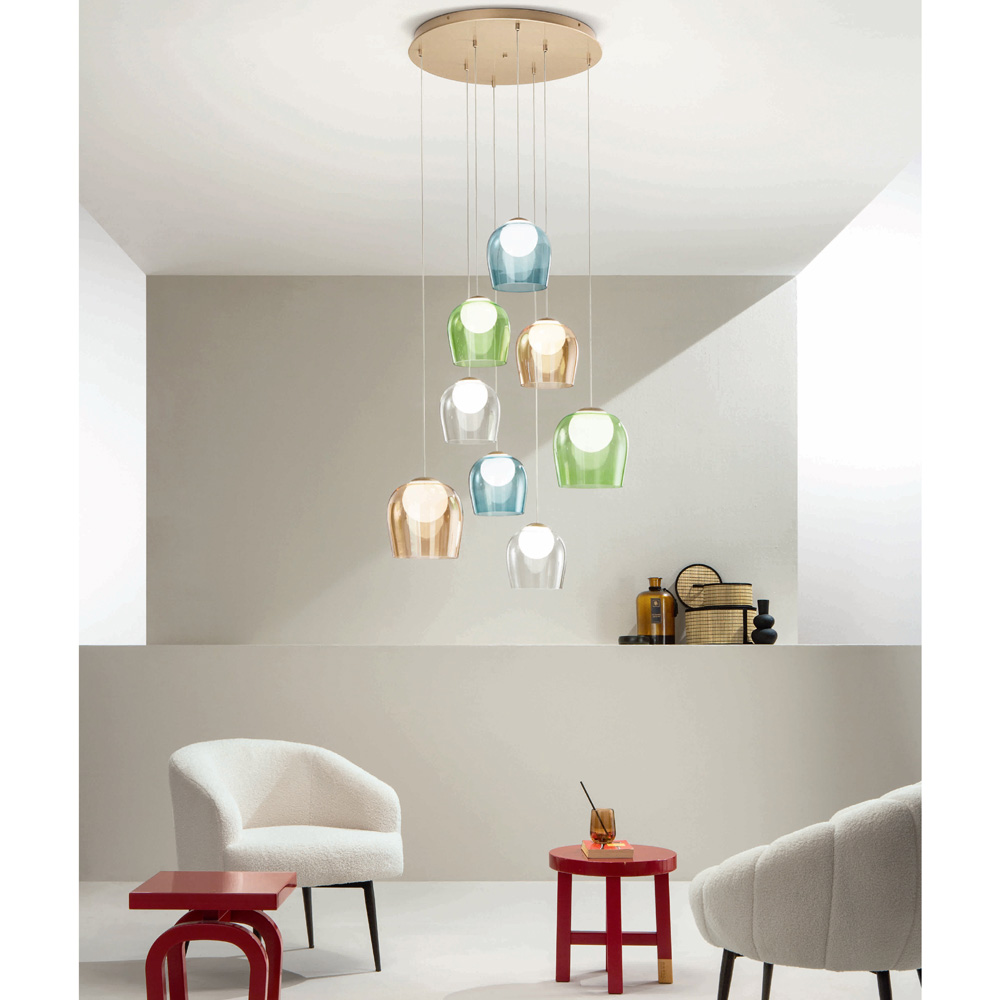 ثرياتم إنتاجها بالكامل في إيطاليا مصنوعة من معدن مطلي باللون الذهبي و 8 مصابيح LED مع غطاء مصباح زجاجي ملون اختياري قابل للإزالة عن طريق فك الكرة الزجاجية. يهدف هذا المنتج إلى تعزيز التقاليد من خلال نهج عصري ، حيث تجتمع الأناقة والرقي والابتكار لابتكار تصاميم جديدة تُضفي على أي بيئة لمسةً من الذوق الرفيع والطابع المميز. ومن أبرز مميزاته تميز الأشكالوجودة المواد المستخدمةوتميز مصدر الإضاءة .