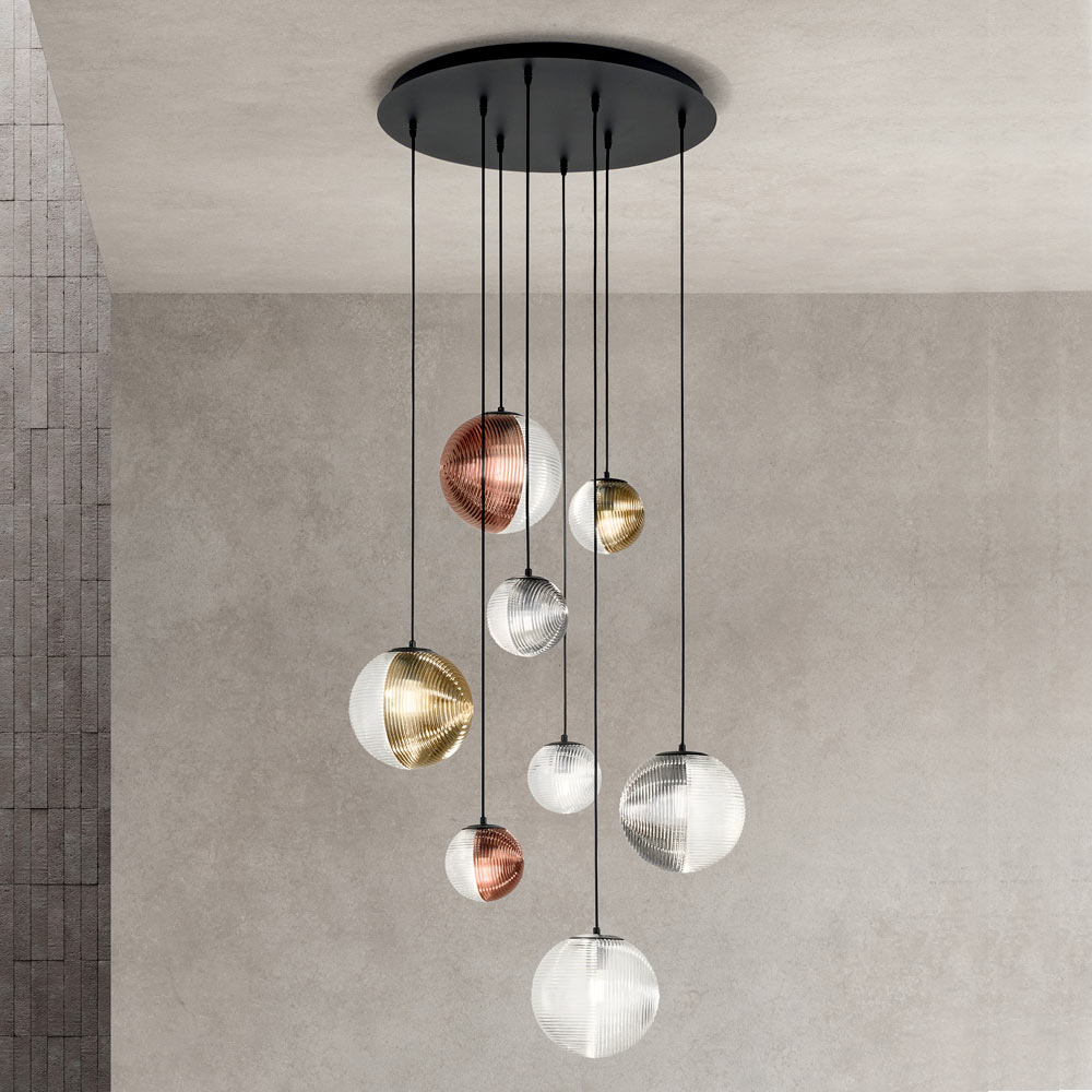 انغمس في أجواء من الأناقة العصرية مع هذه الثريا المعلقة، مثالية لإضفاء لمسة من الفخامة غير المتكلفّة على أي مساحة. تتدلى الكرات المضيئة في رقصة متناغمة من الضوء والانعكاسات ، كل منها مُغلّف بزجاج منفوخ بلمسات نهائية مختلفة، عاكسةً ضوءًا دافئًا ومُرحّبًا .