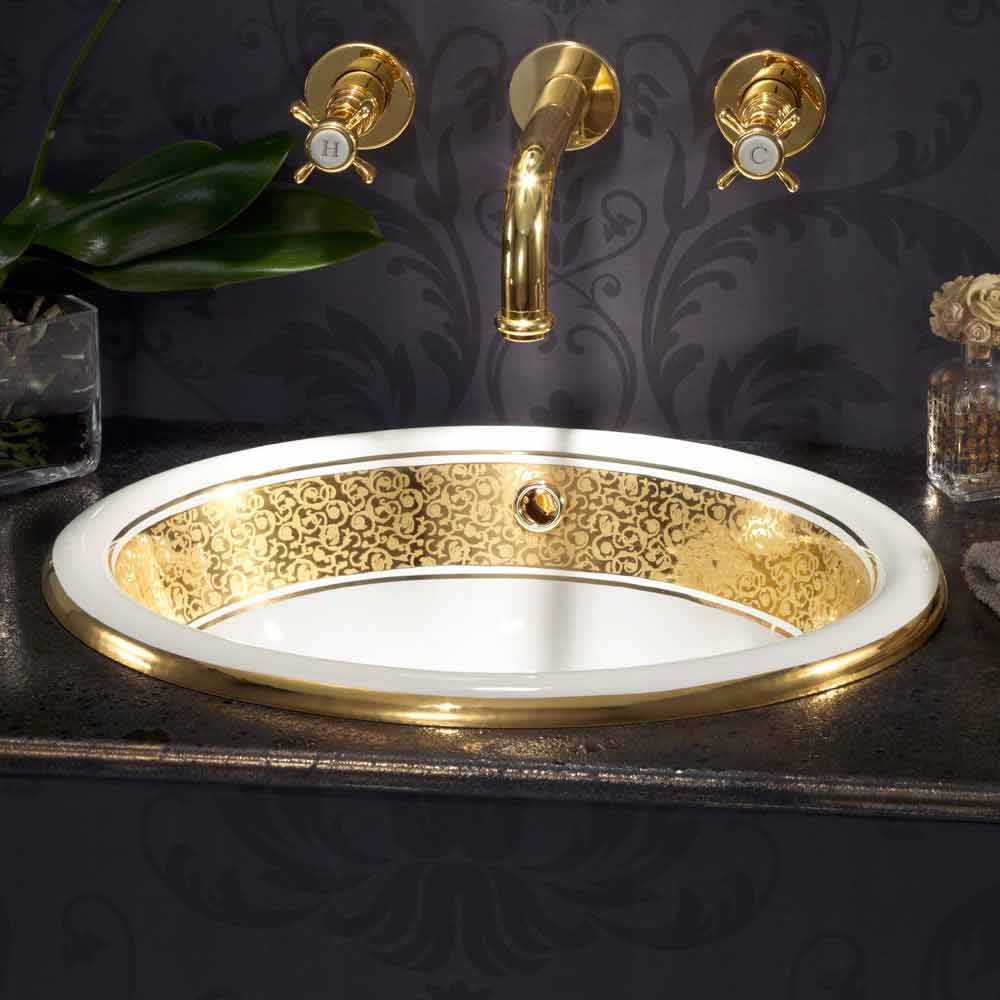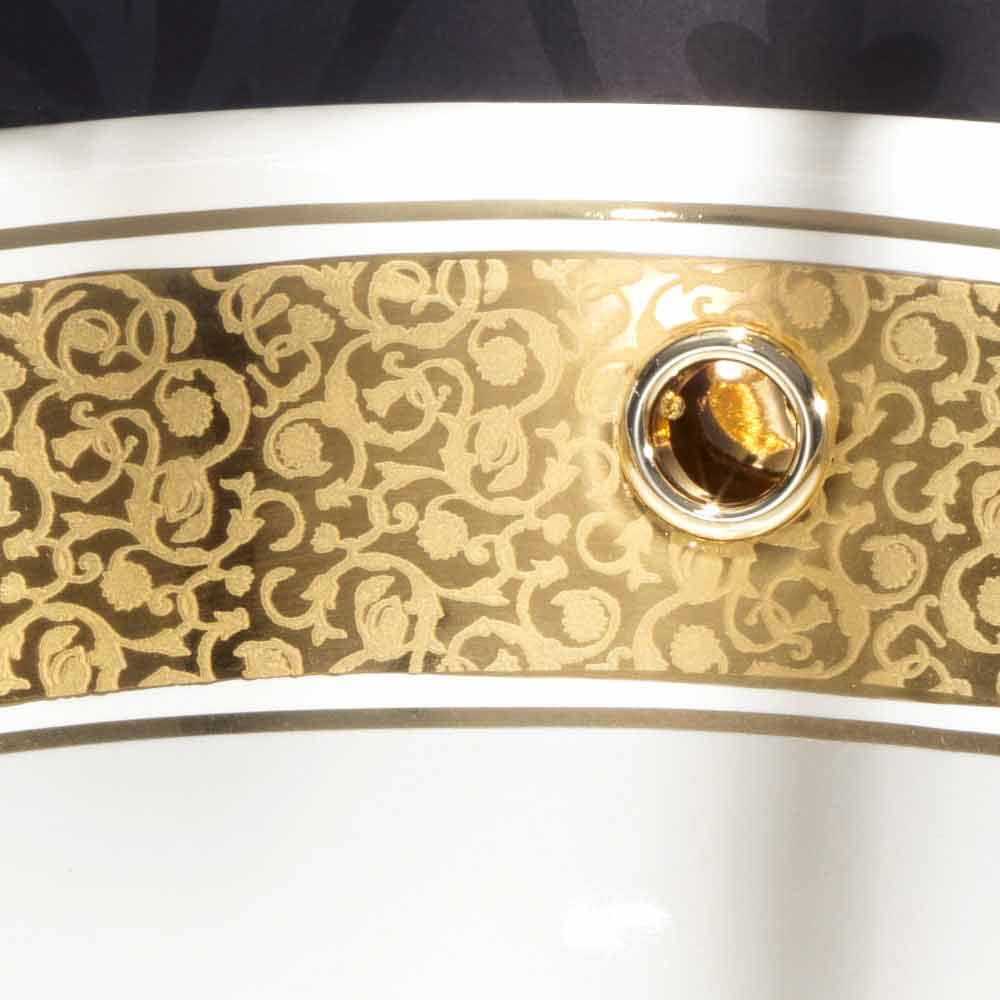 حوض غسيل دائري مدمج مزخرف بطين النار والذهب، أوتيس حوض حمام مدمج مصنوع في إيطاليا من طين النار المصنوع يدويًا والمزين بشريط ذهبي مرتفع وشريحتين وحافة من الذهب عيار 24 قيراطًا.