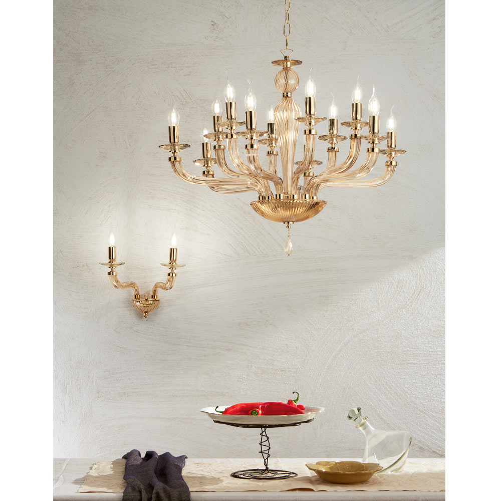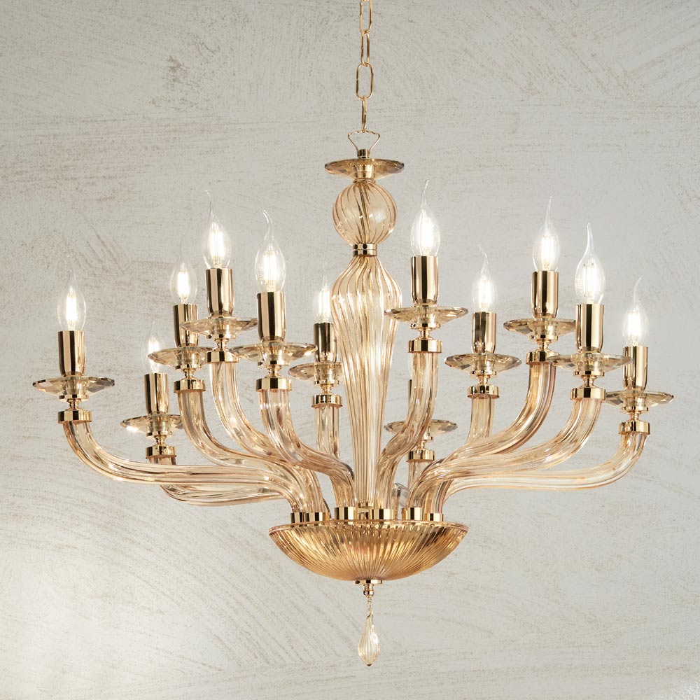 تتكون هذه الثريا ذات الطراز الكلاسيكي من 12 ذراعًا منحنيًا مصنوعة من الزجاج يدويًا في إيطاليا بتأثير "ريجاتون" باللون الكهرماني والتي تدعم الصحون التي تستضيف مصادر الضوء.