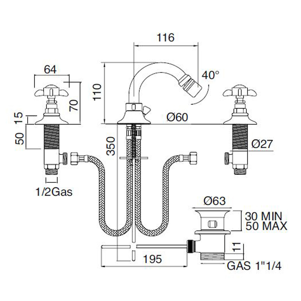 صنبور بيديه ثلاثي الفتحات مصنوع يدويًا من النحاس بتصميم كلاسيكي، عالي الجودة صنع في إيطاليا.