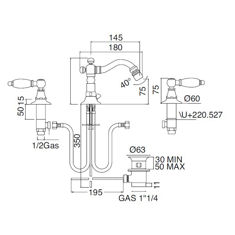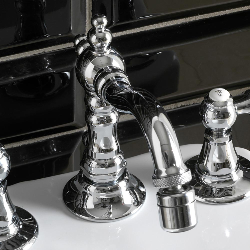 صنبور بيديه ثلاثي الفتحات مع رافعات على الطراز الكلاسيكي من النحاس، صناعة عالية الجودة في إيطاليا.