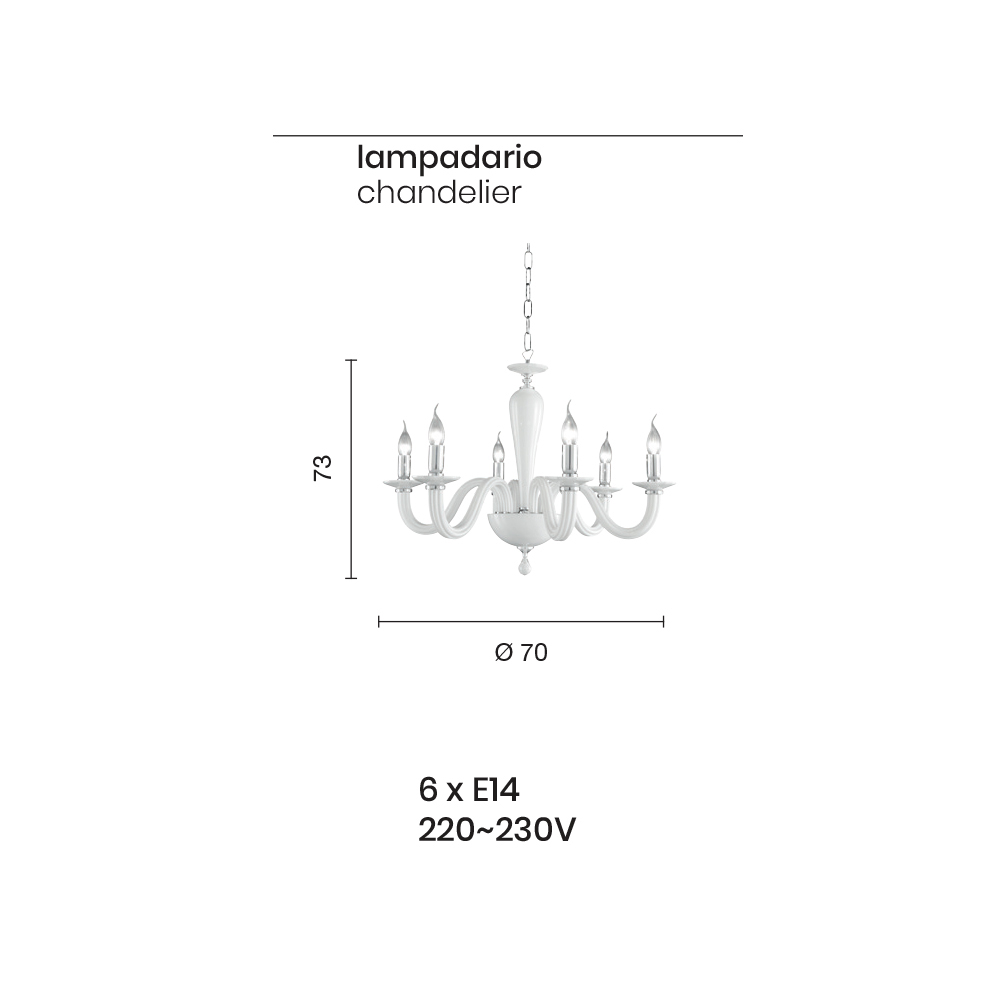 من الجودة العالية للمواد المستخدمة والاهتمام الخاص بالتفاصيل، ولدت هذه الثريا الفاخرة ذات الطراز الكلاسيكي الخالد ، المصنوعة بالكامل في إيطاليا. مصنوع من 6 أذرع مقوسة من الزجاج المصنوع يدويًا مع تفاصيل معدنية مطلية بالكروم ، وتحتوي ألواح الكريستال المقطوعة على مصادر الضوء. يتكون جسم الثريا من شكل أسطواني من الزجاج الشفاف وصحن كريستالي يقع في أعلى نهاية الهيكل، مزين بمعلقة دائرية من الكريستال البصري. مظهرها الملكي المهيب يضفي على كل غرفة، من غرفة المعيشة إلى غرفة النوم ، جوًا راقيًا وأنيقًا.