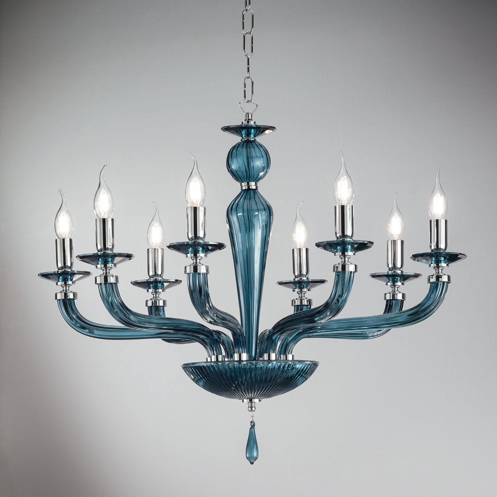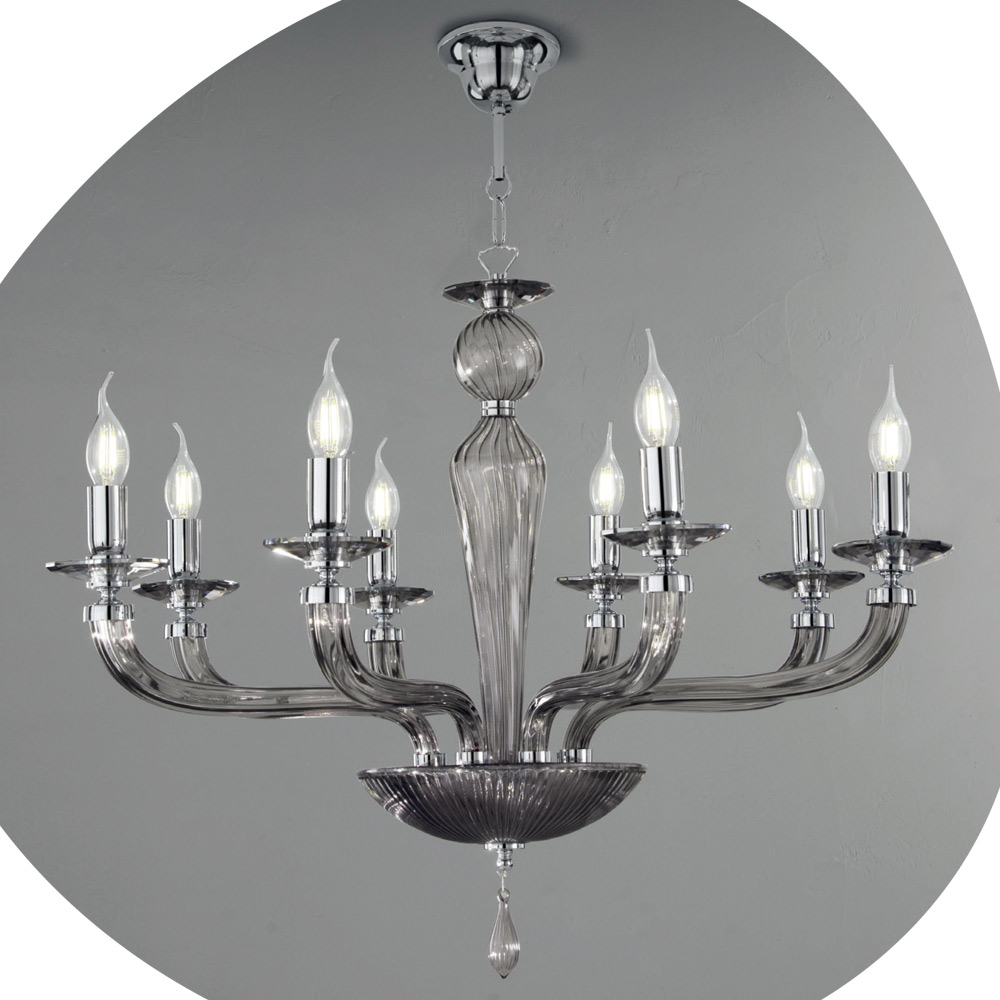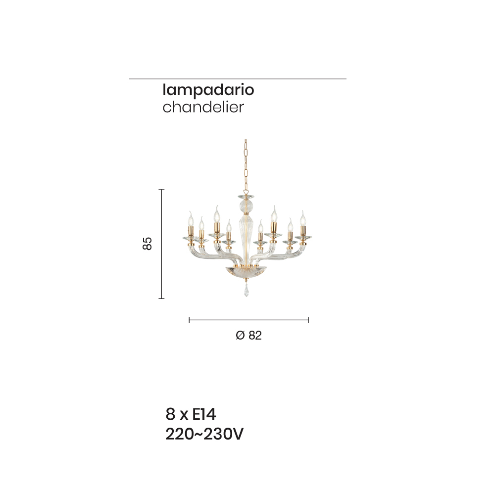 تتكون هذه الثريا ذات الطراز الكلاسيكي من 8 أذرع منحنية مصنوعة من الزجاج المصنوع يدويًا في إيطاليا بتأثير "ريجاتون" باللون الكهرماني والتي تدعم الصحون التي تستضيف مصادر الضوء.