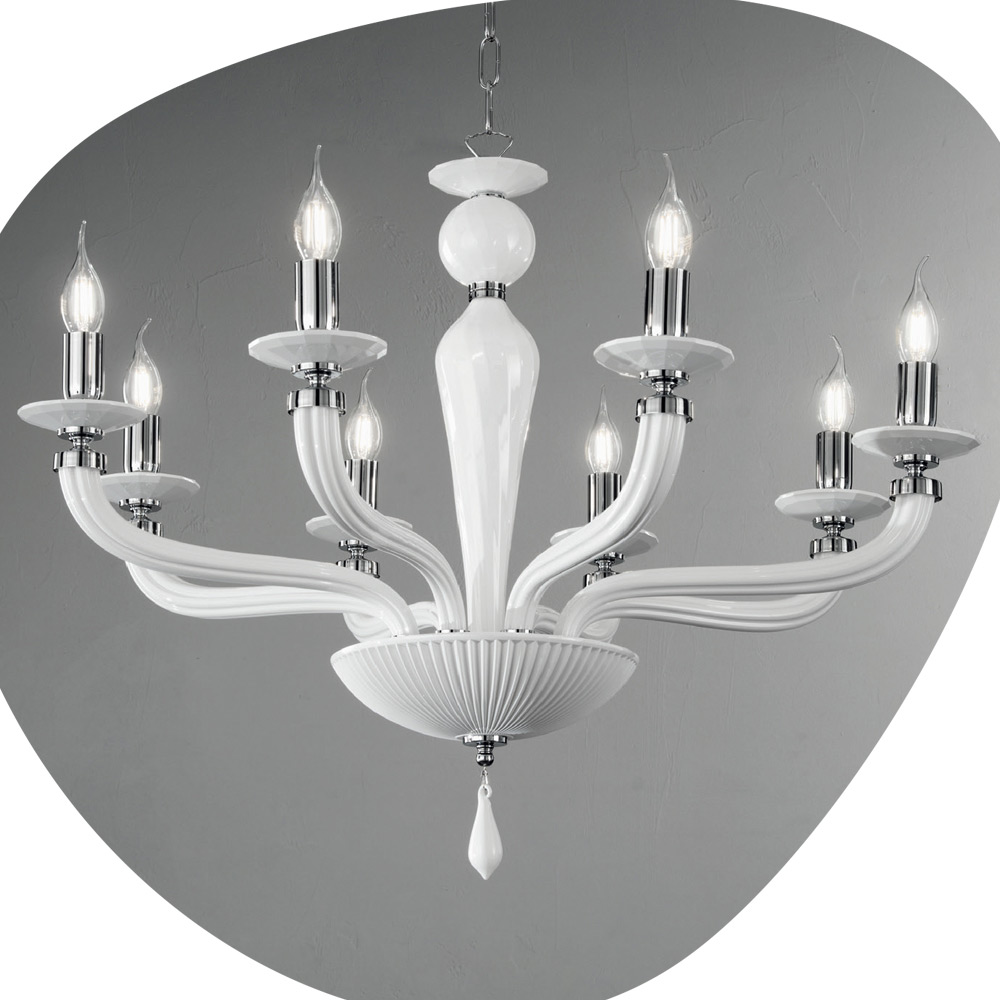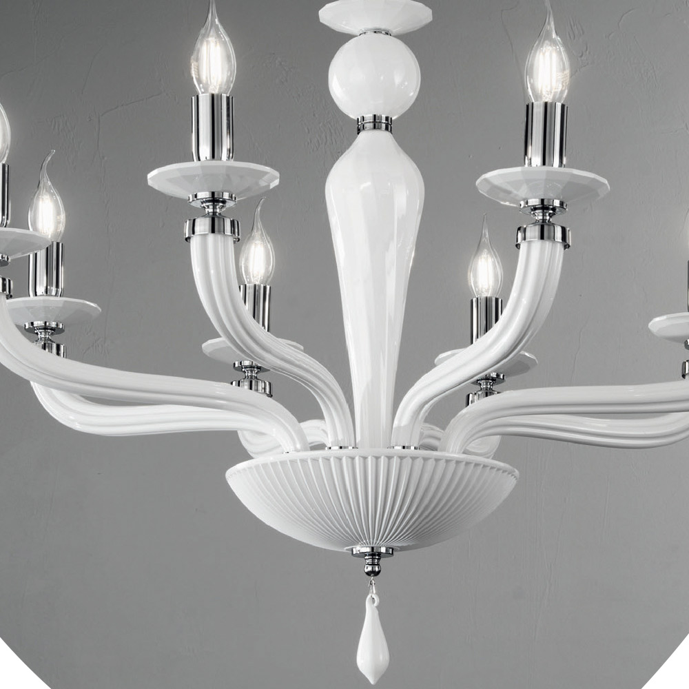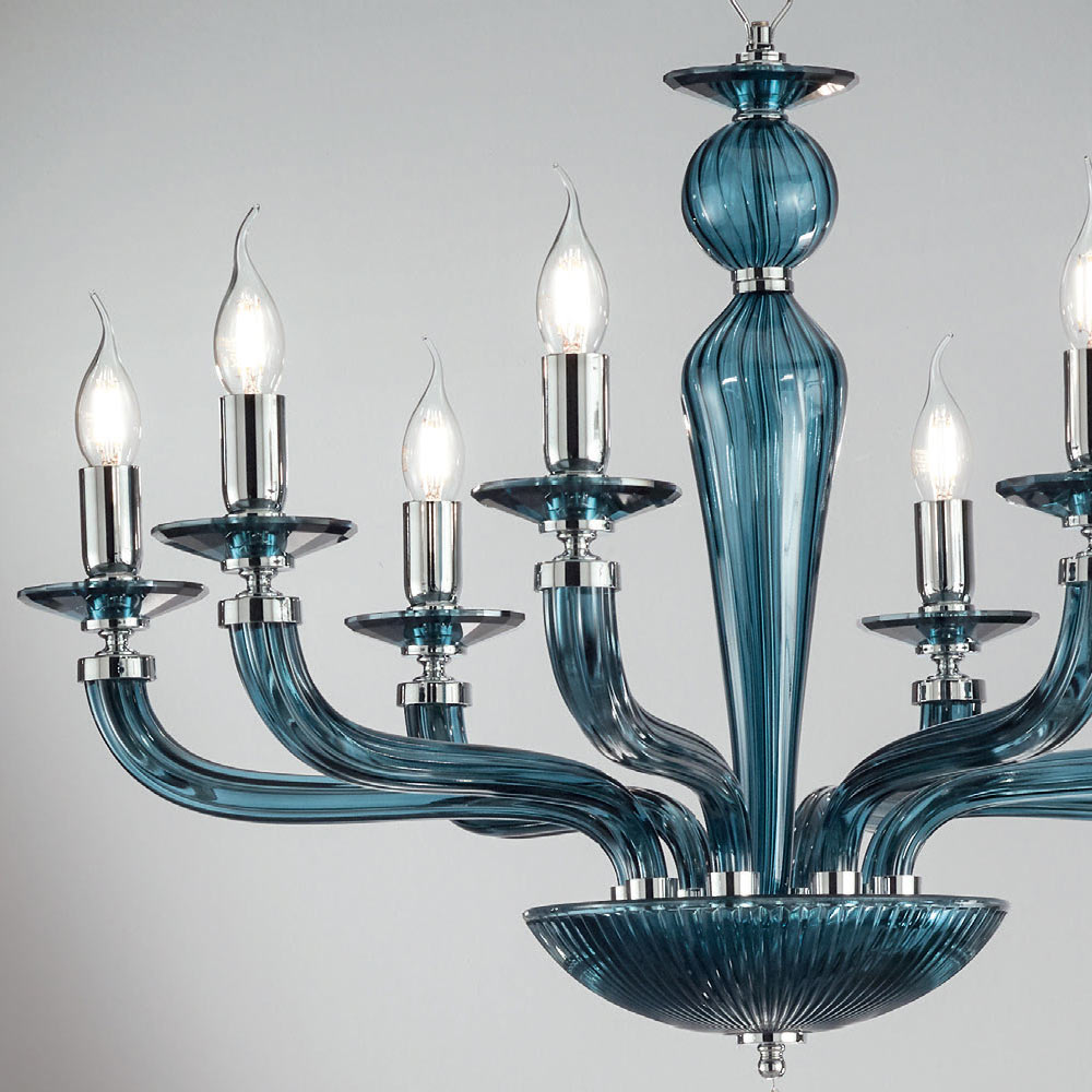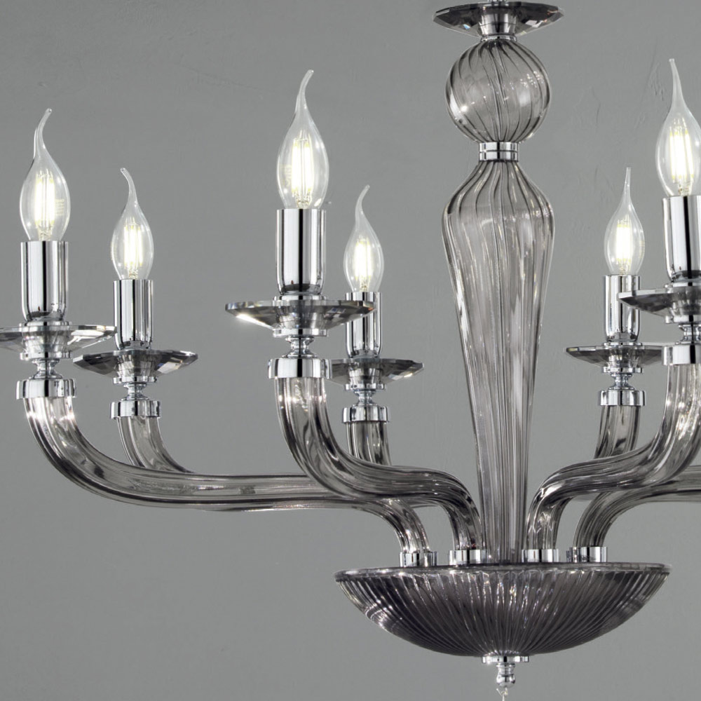 تتكون هذه الثريا ذات الطراز الكلاسيكي من 8 أذرع منحنية مصنوعة من الزجاج المصنوع يدويًا في إيطاليا بتأثير "ريجاتون" باللون الكهرماني والتي تدعم الصحون التي تستضيف مصادر الضوء.