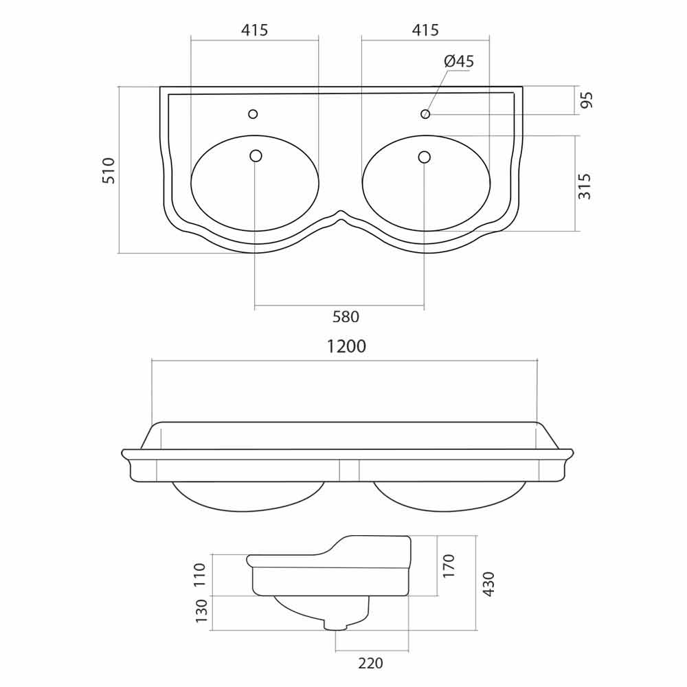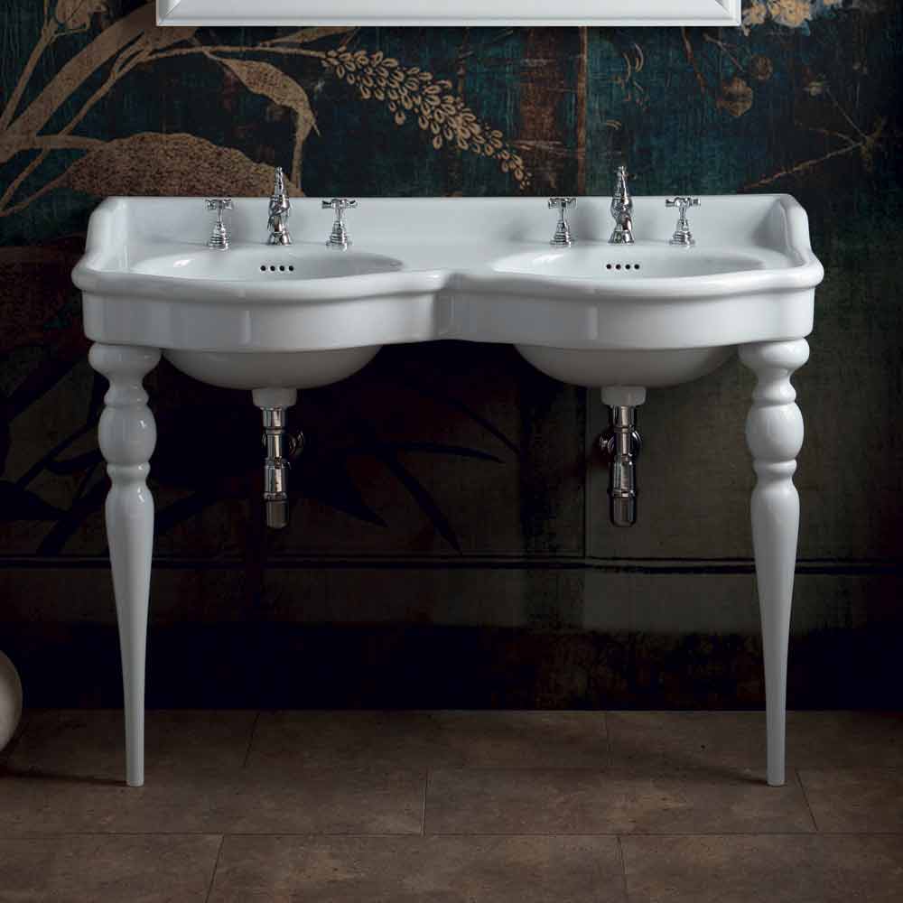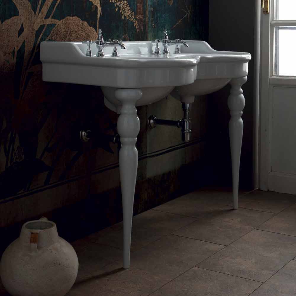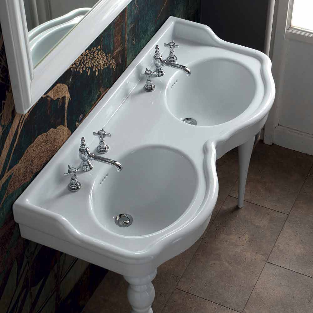 وحدة تحكم حمام مزدوجة الحوض من السيراميك الأبيض الكلاسيكي، ماجدة حوض غسيل كونسول على سطح العمل مع حوض مزدوج مصنوع بالكامل من السيراميك الأبيض. يتميز بتصميم كلاسيكي وهندسة ناعمة، وهو قادر على إعادة خلق جو هادئ في حمامك.