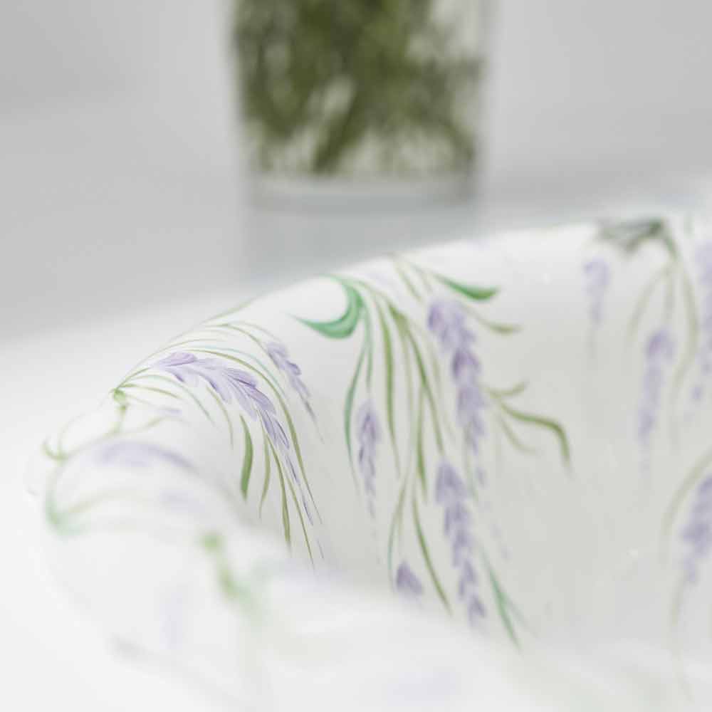 حوض غسيل مدمج من البورسلين مزخرف يدويًا في إيطاليا، سانتياغو حوض حمام مدمج مصنوع في إيطاليا من البورسلين الأبيض الفاخر مع زخارف داخلية من أغصان اللافندر المصنوعة يدويًا بتقنية الفرشاة.