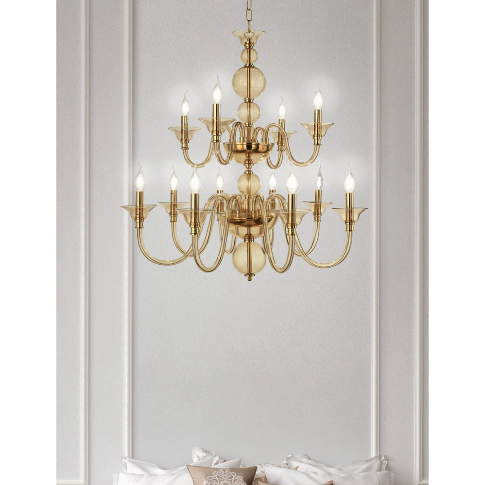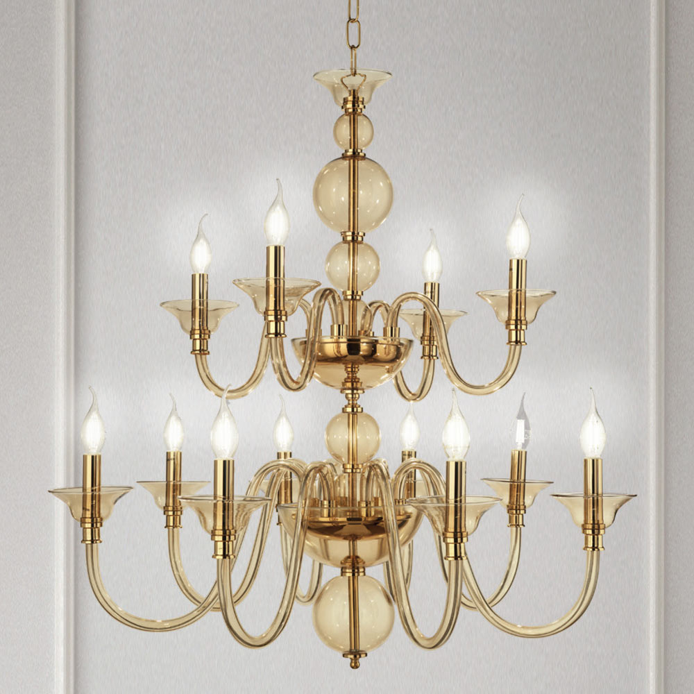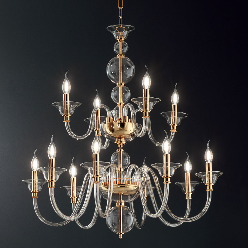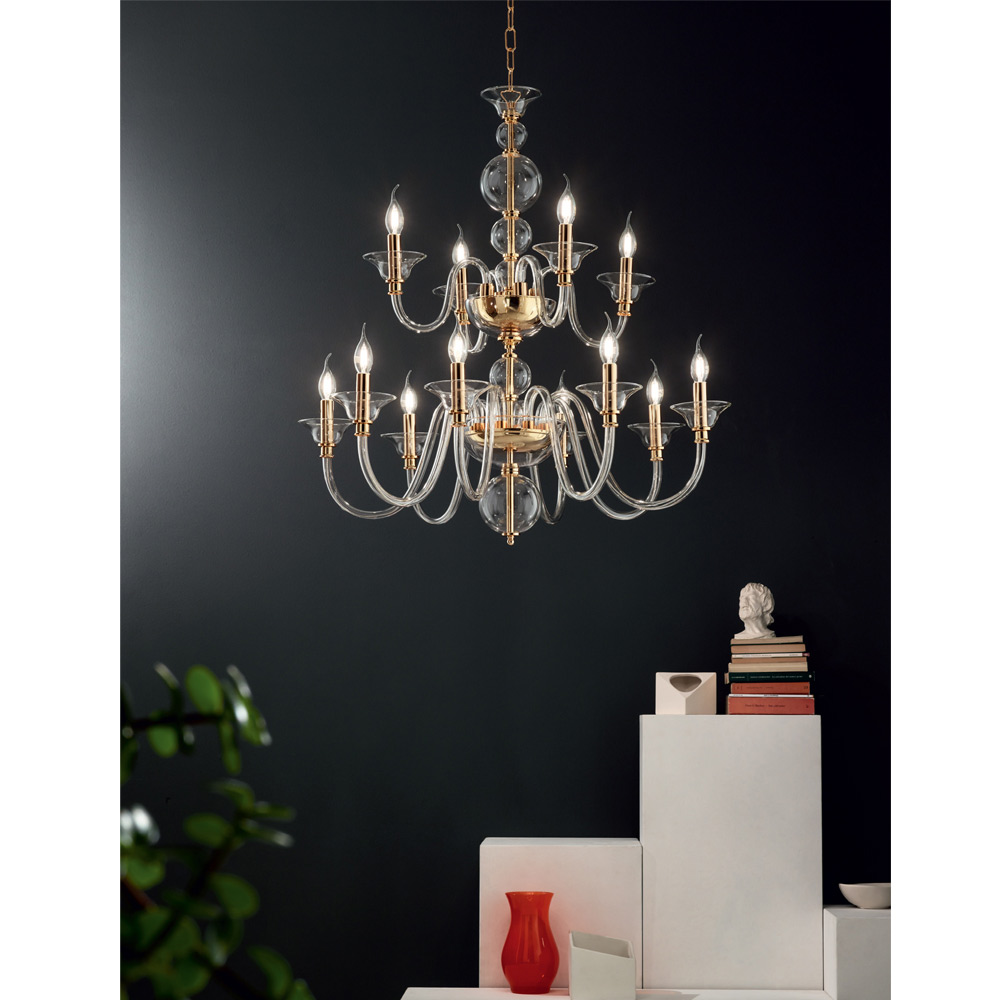 ثريا كلاسيكية مكونة من 12 ضوءًا من المعدن الذهبي والزجاج المصنوع يدويًا، فاخرة مصنوعة في إيطاليا.